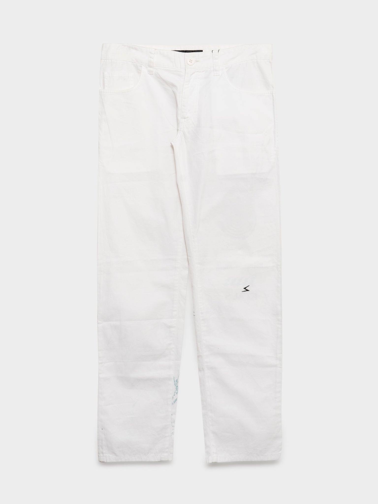 From Undercover's SS06 collection comes this pair of white pants with graphics from the collection including an embroidered face