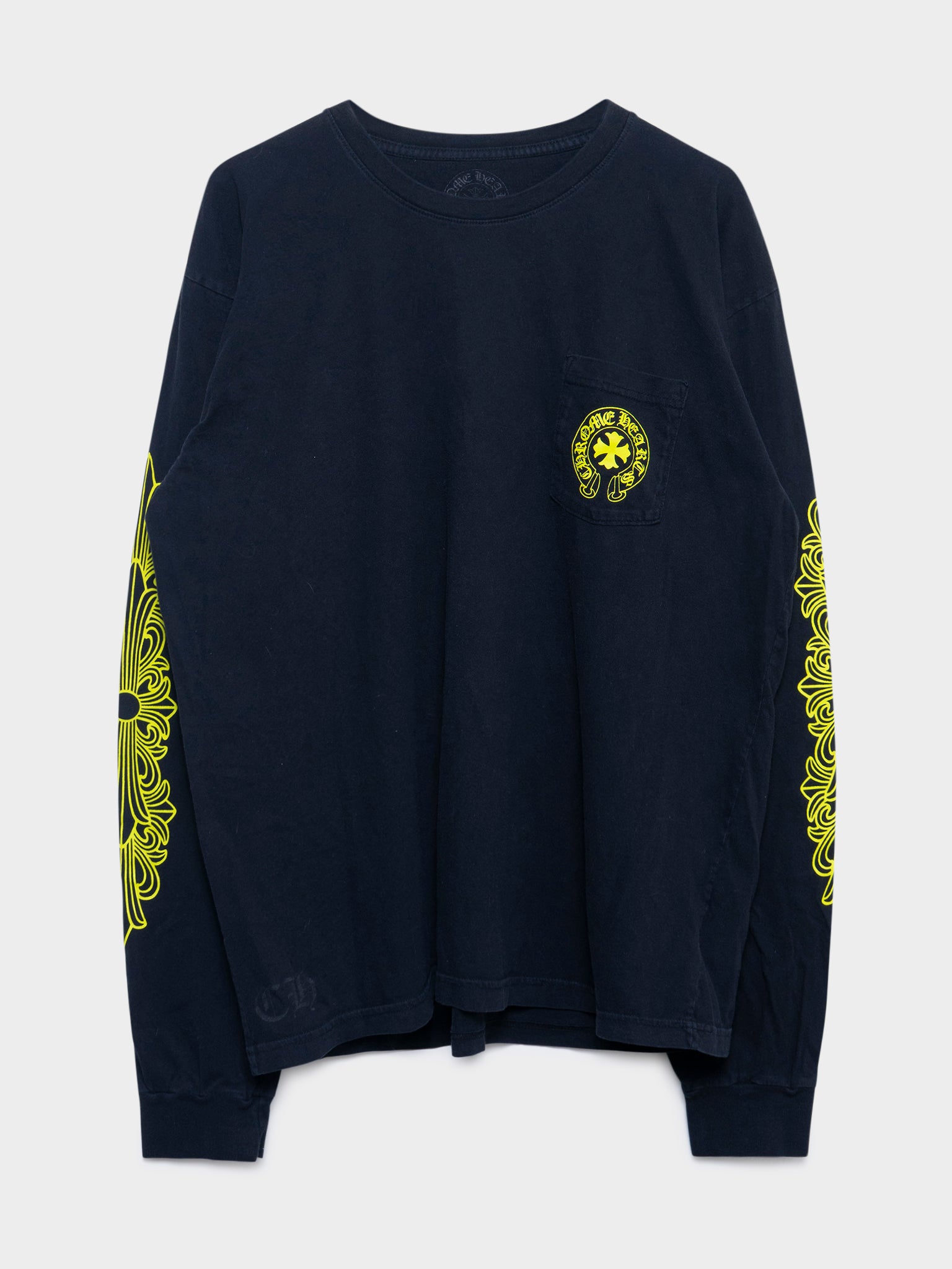 A black Chrome Hearts long sleeve tee with bright yellow eye chart design on the black and double floral motif down the sleeve.
