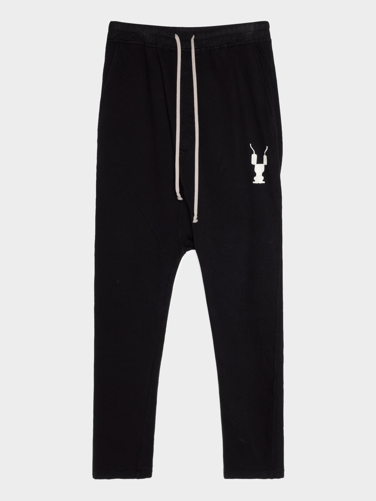 A pair of Rick Owens DRKSHDW sweatpants with a large DRKSHDW logo on the thigh and the classic extended drawstrings.