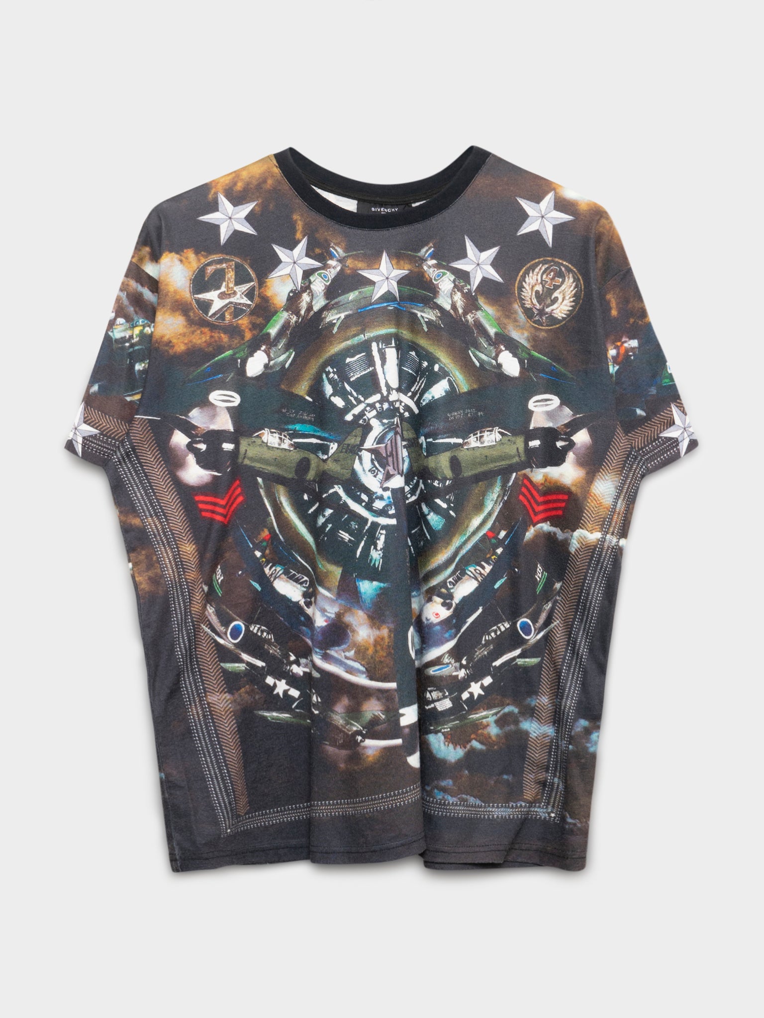 An oversized colorful Givenchy tee covered in abstract fighter jets flying around