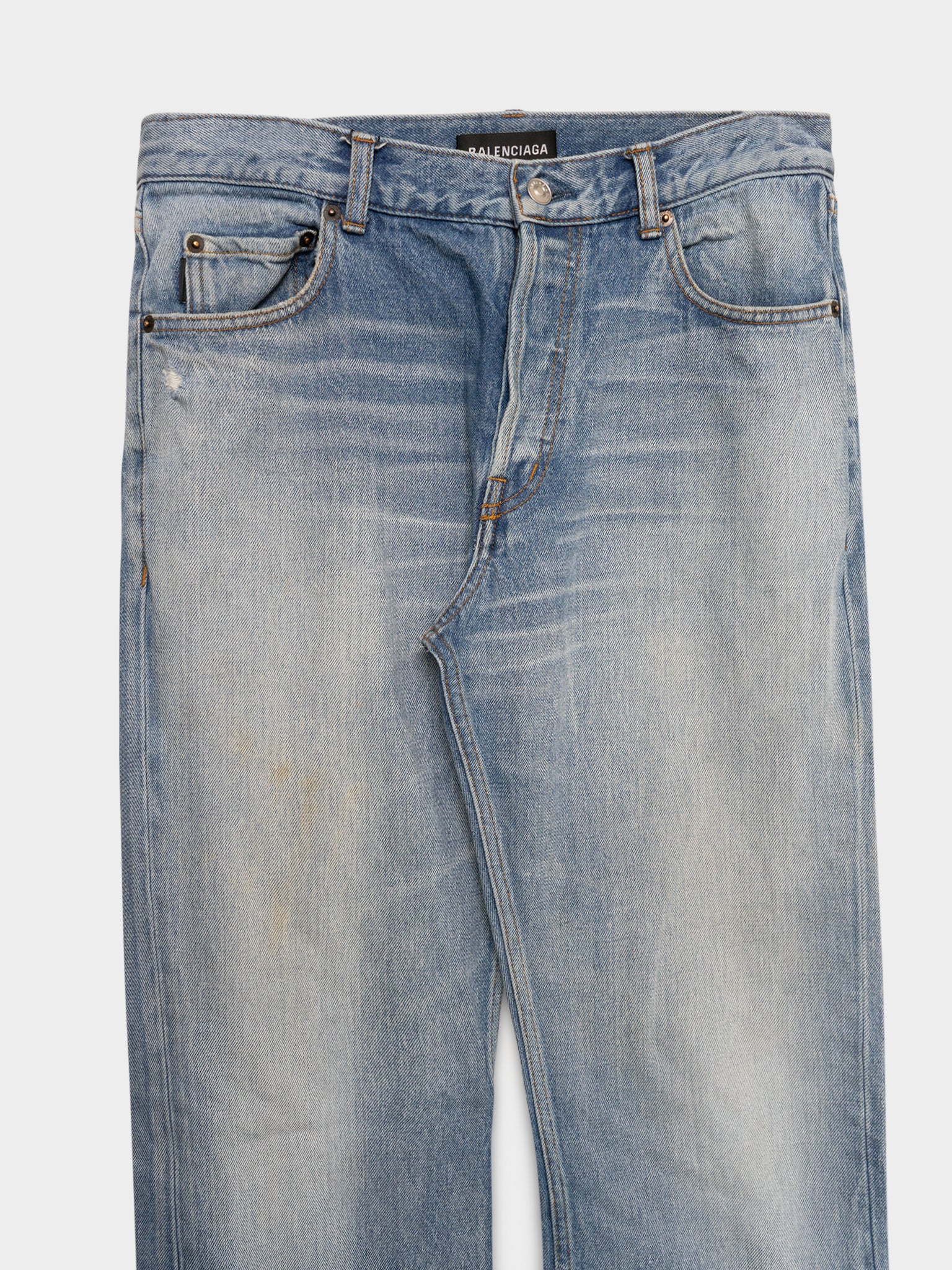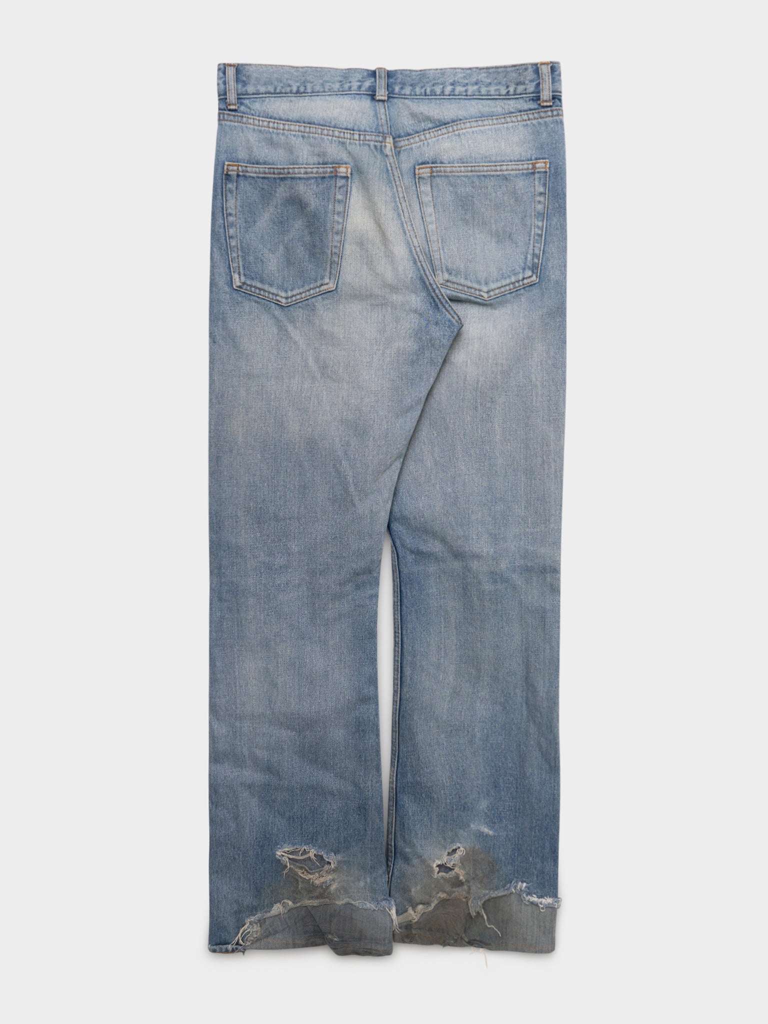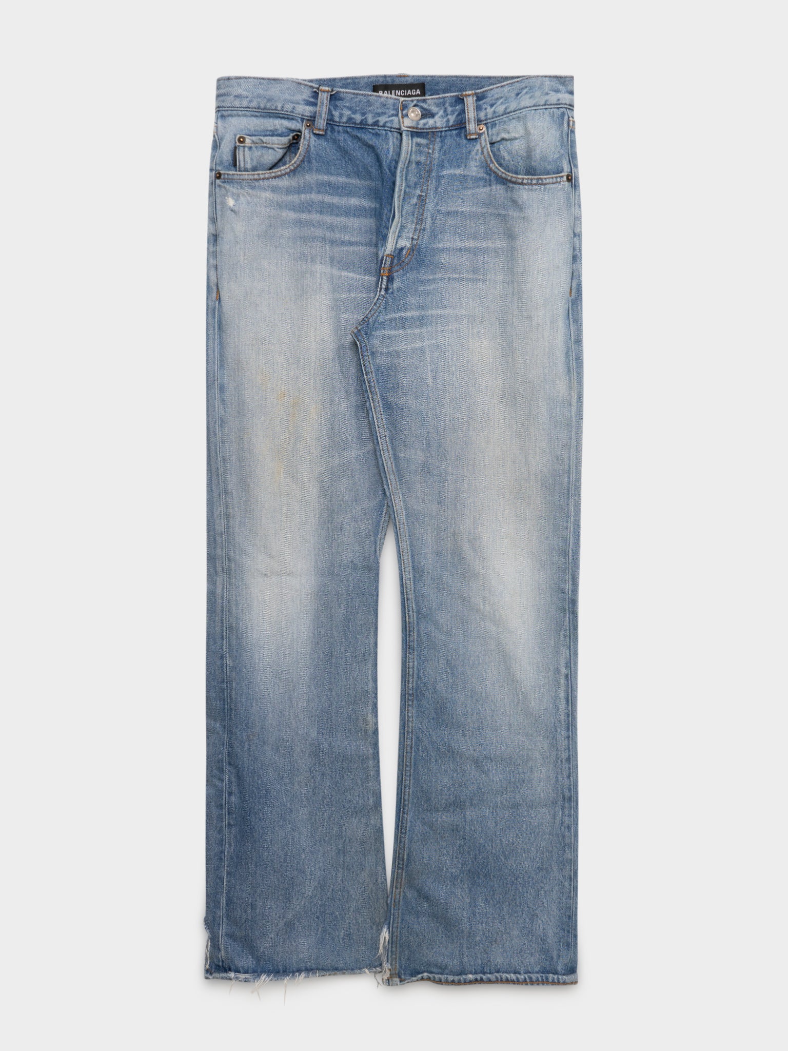 A pair of lightwash Balenciaga flared jeans with some nice heel bite already started for you to continue the wear.
