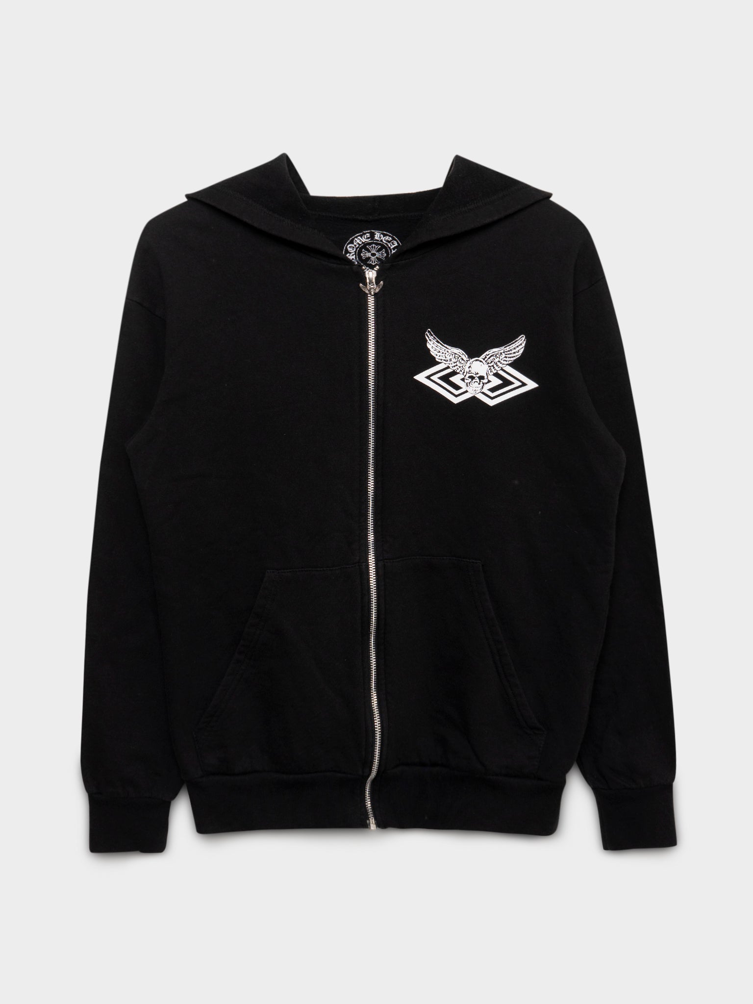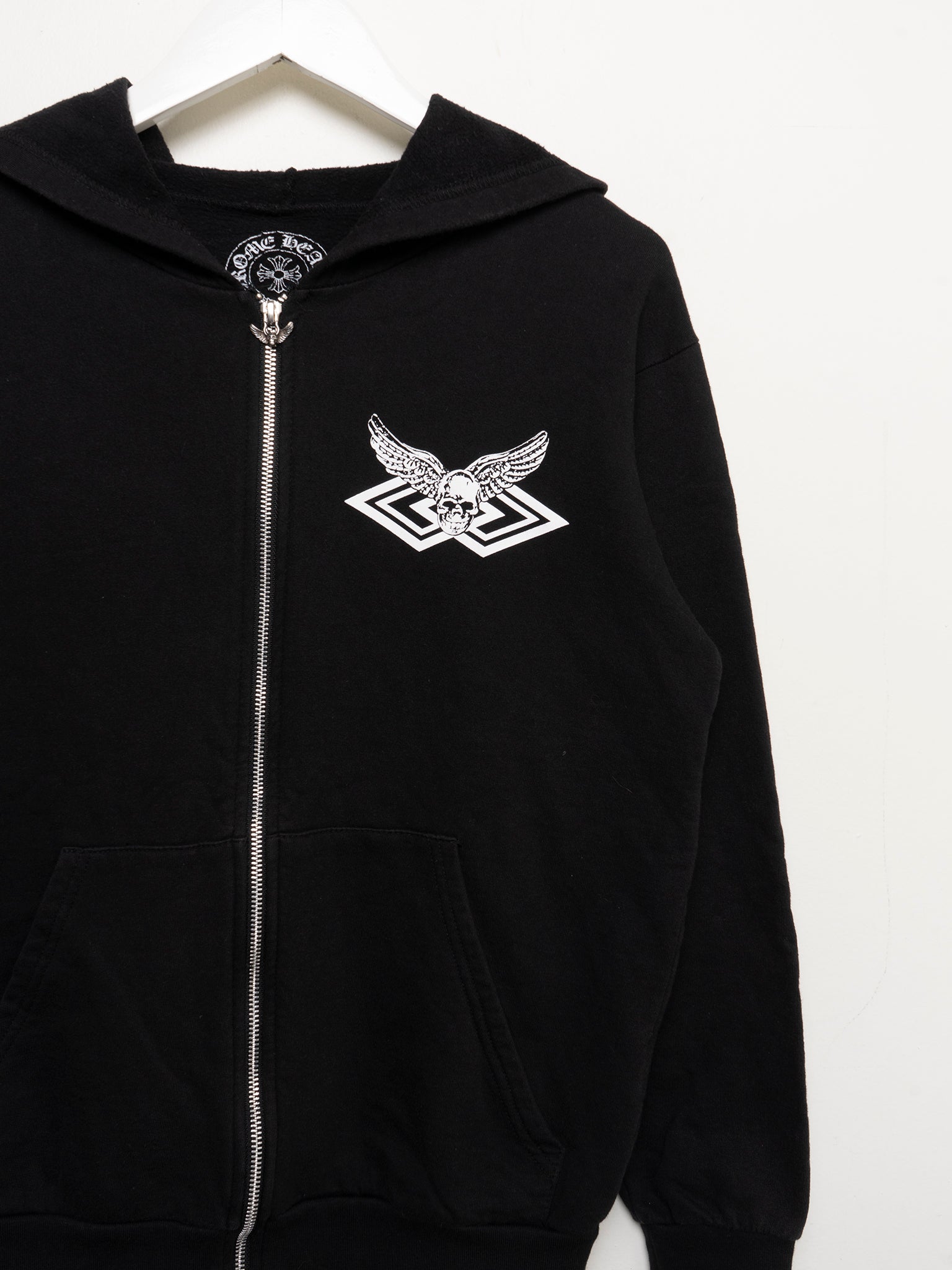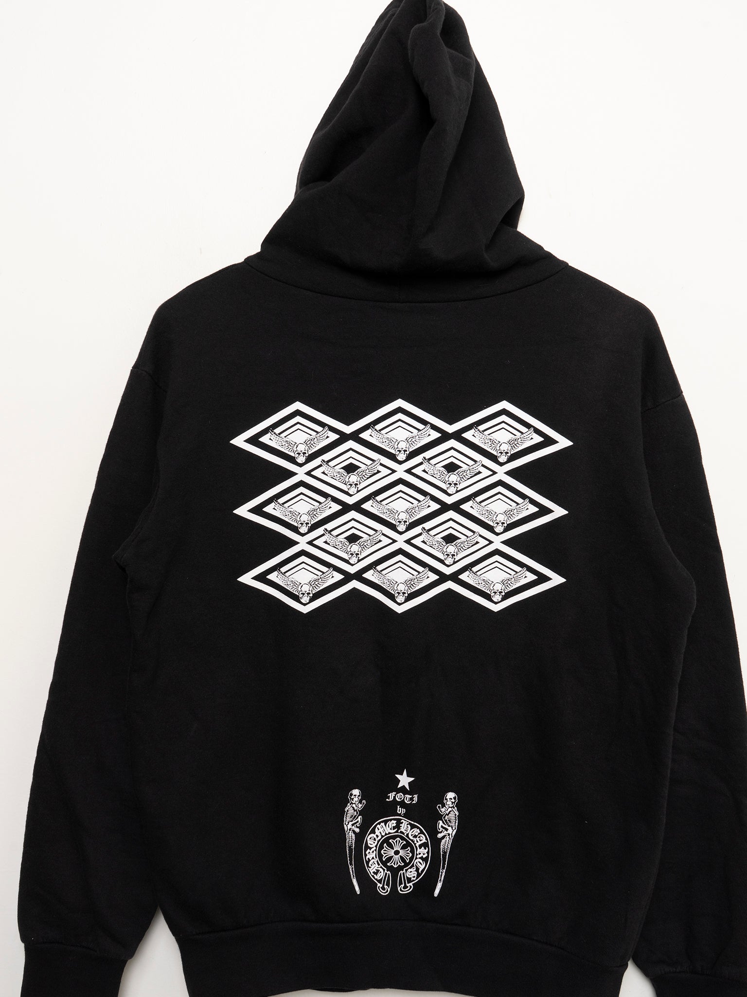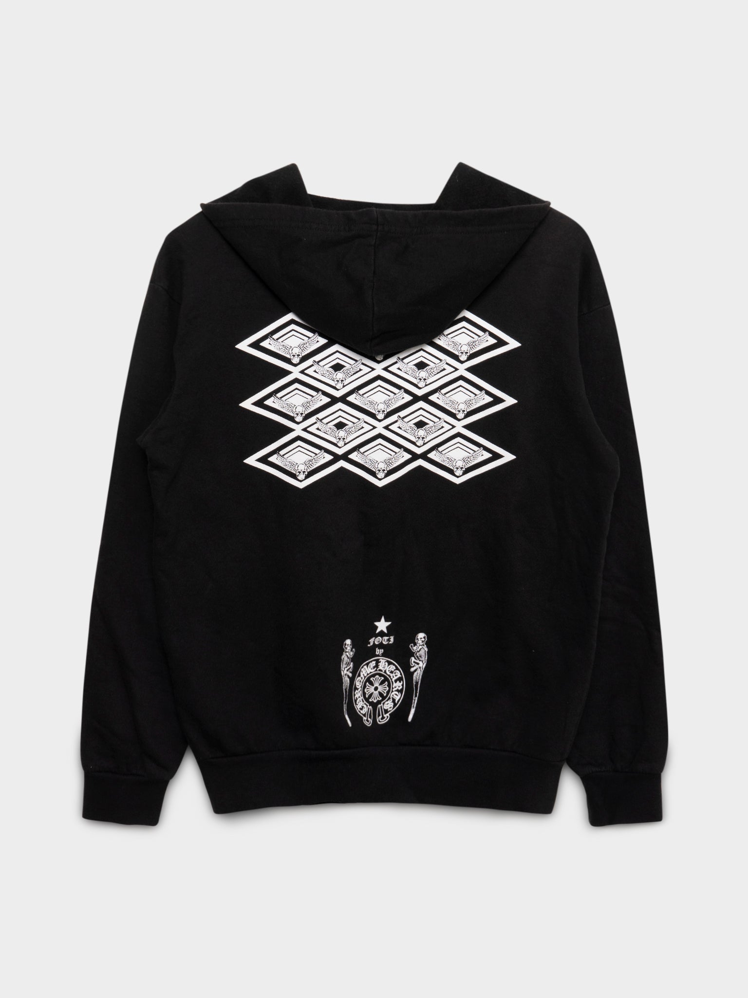 A black Chrome Hearts zip up hoodie with the Foti skull figure on chest and a geometric graphic on back. Best of all, it contains a sterling silver Foti Skull zipper.