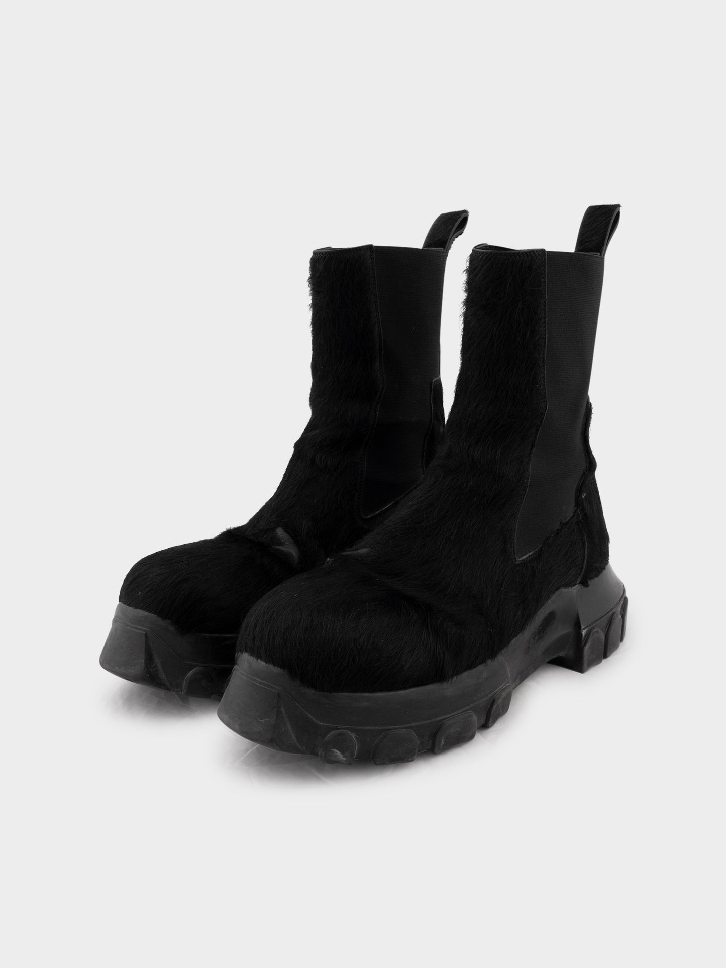 A pair of Rick Owens Bozo chelsea boots covered in fur with large chunky sole.