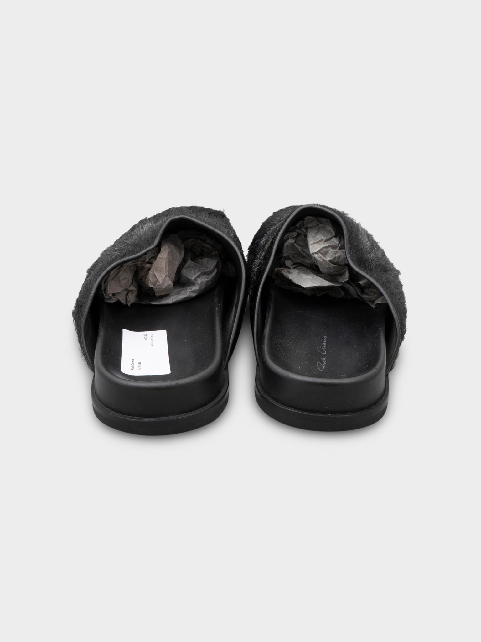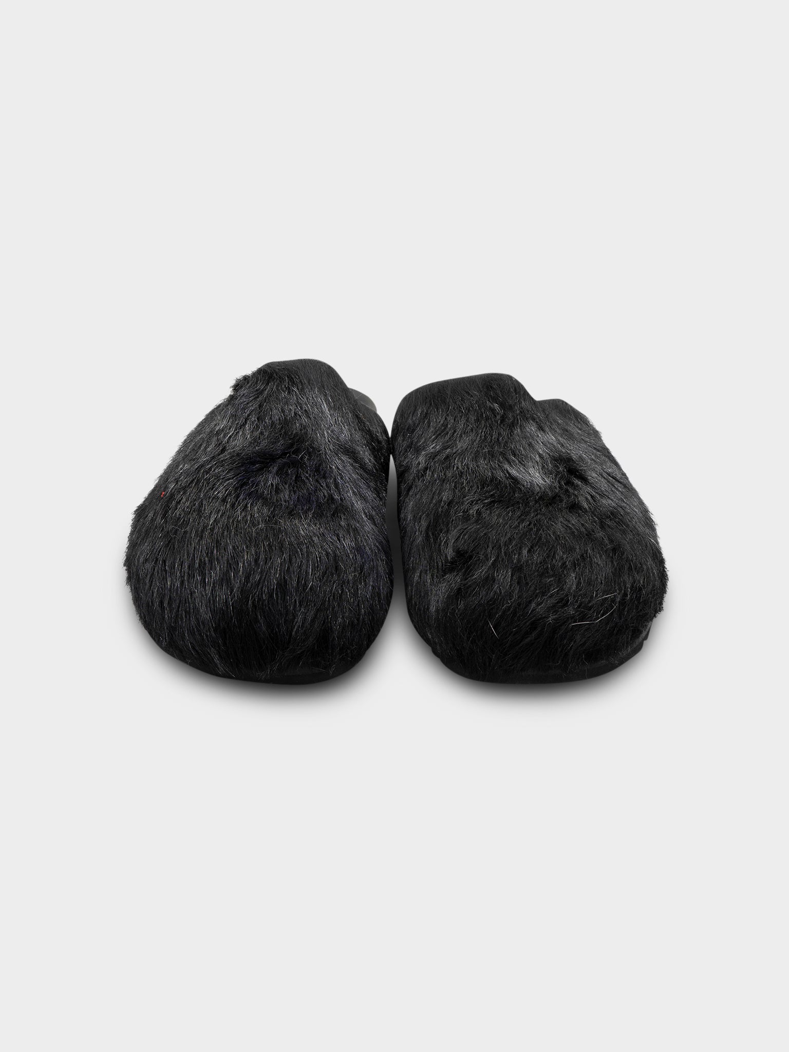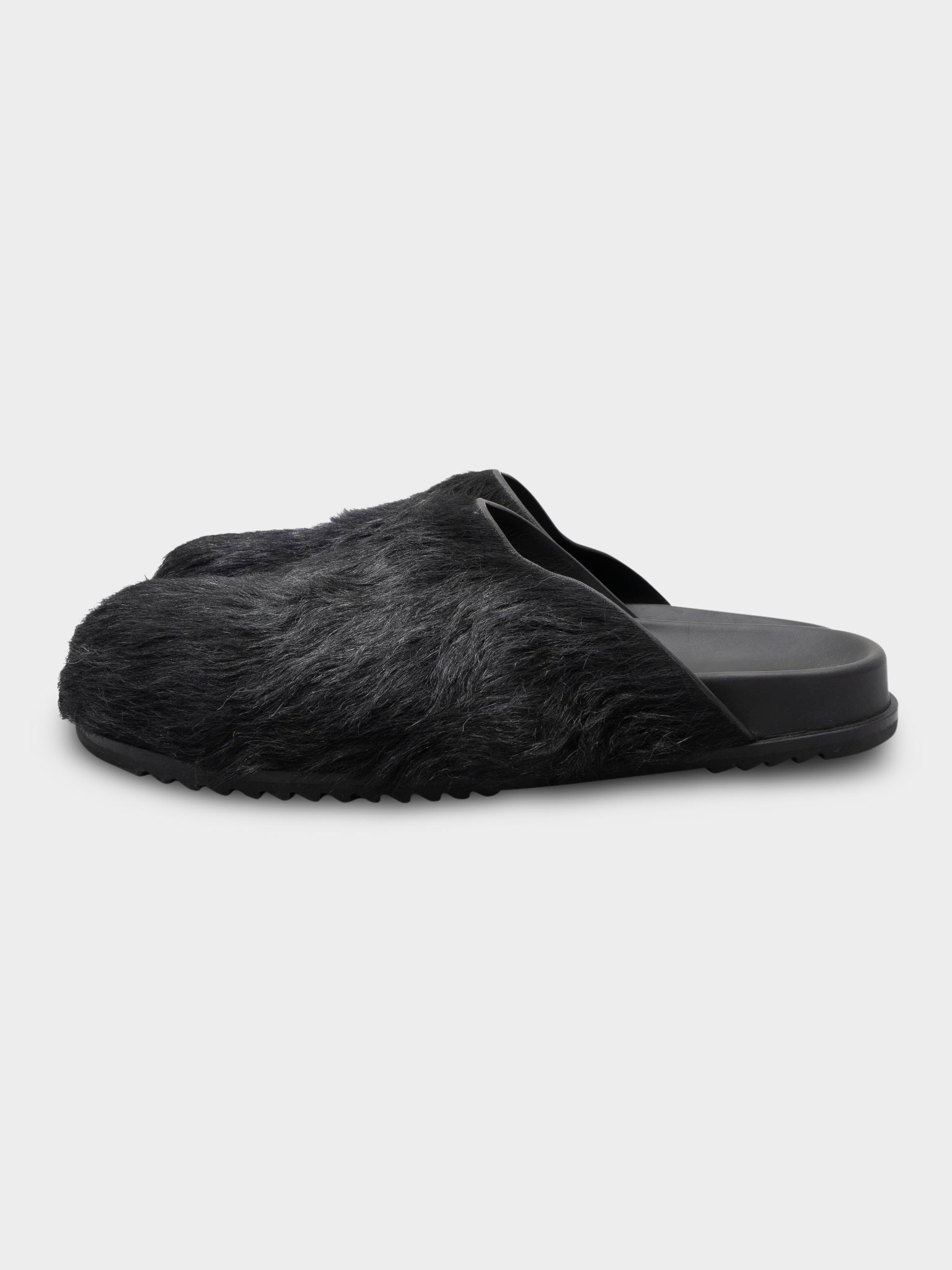 A pair of Rick Owens black mules covered in a faux fur.