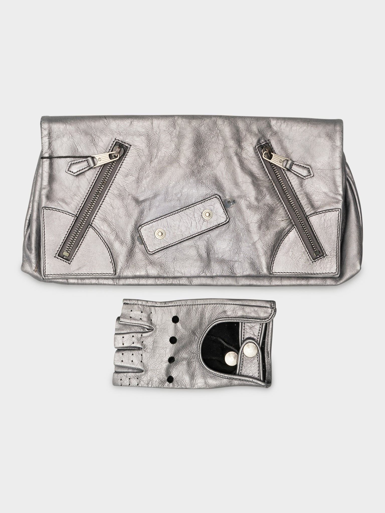 A metallic silver Alexander McQueen clutch bag with built in fingerless glove to make the clutching part a lot nicer