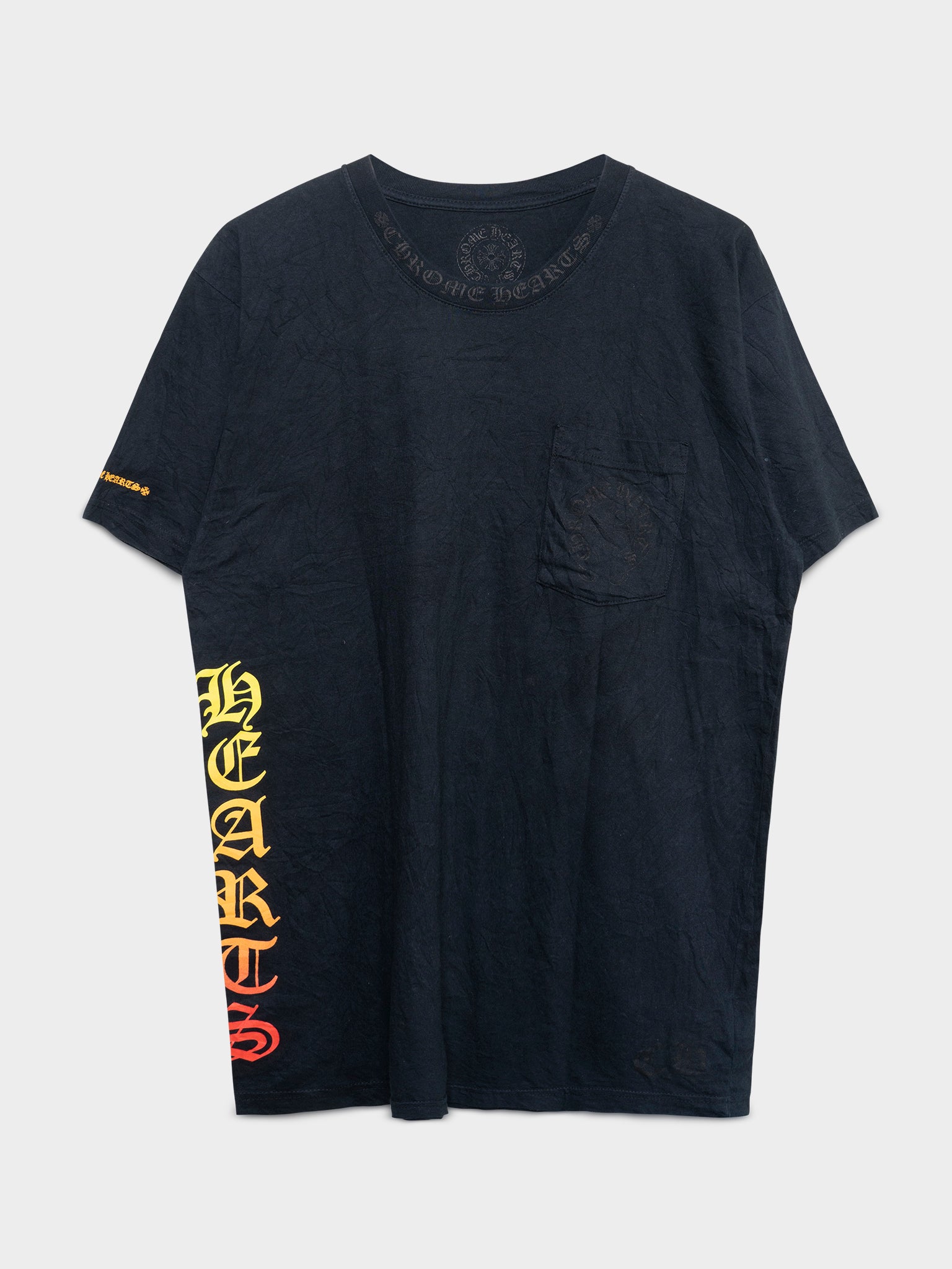 A black Chrome Hearts tee with bursting gradient logo and brand scripted along the collar