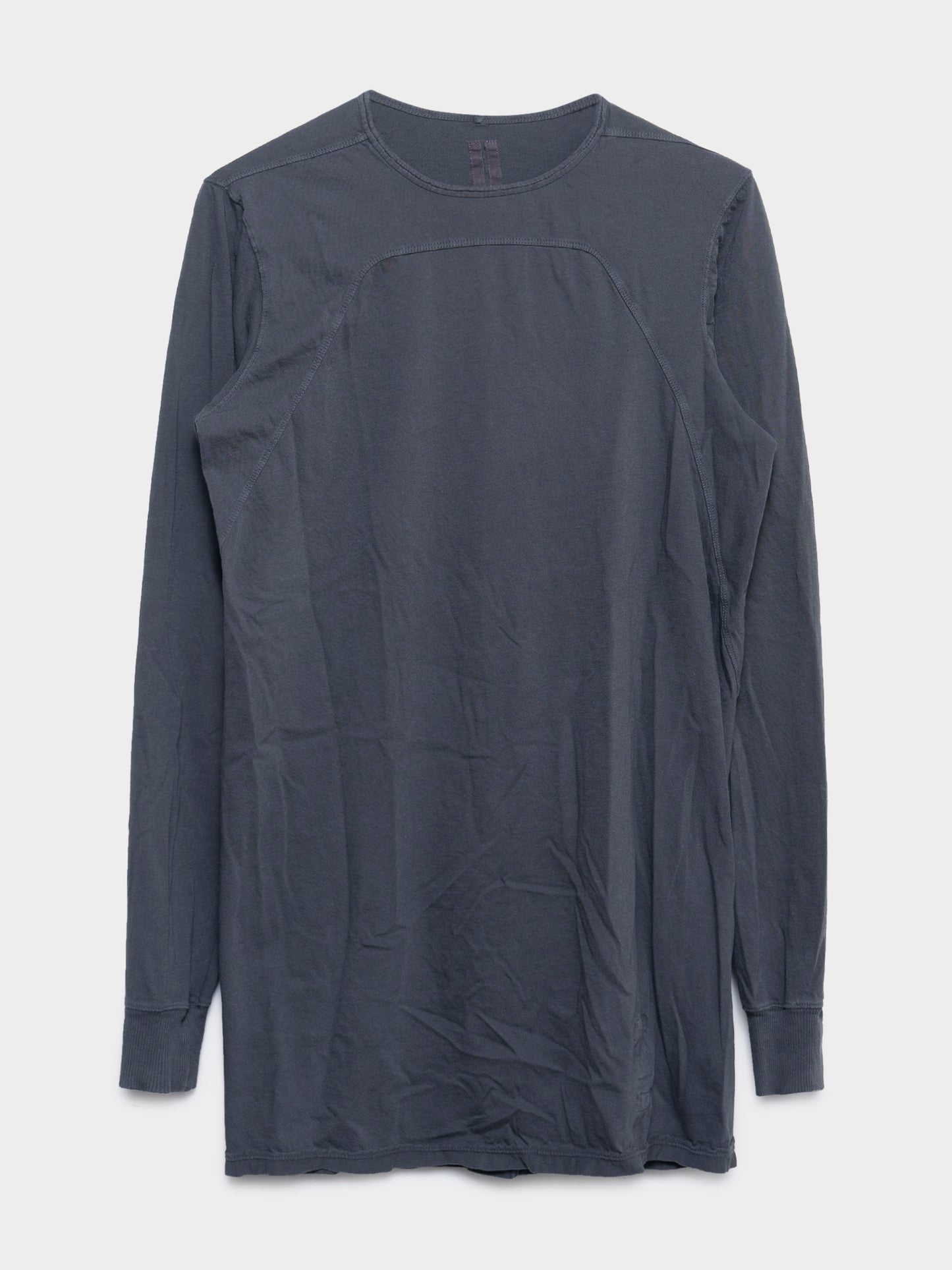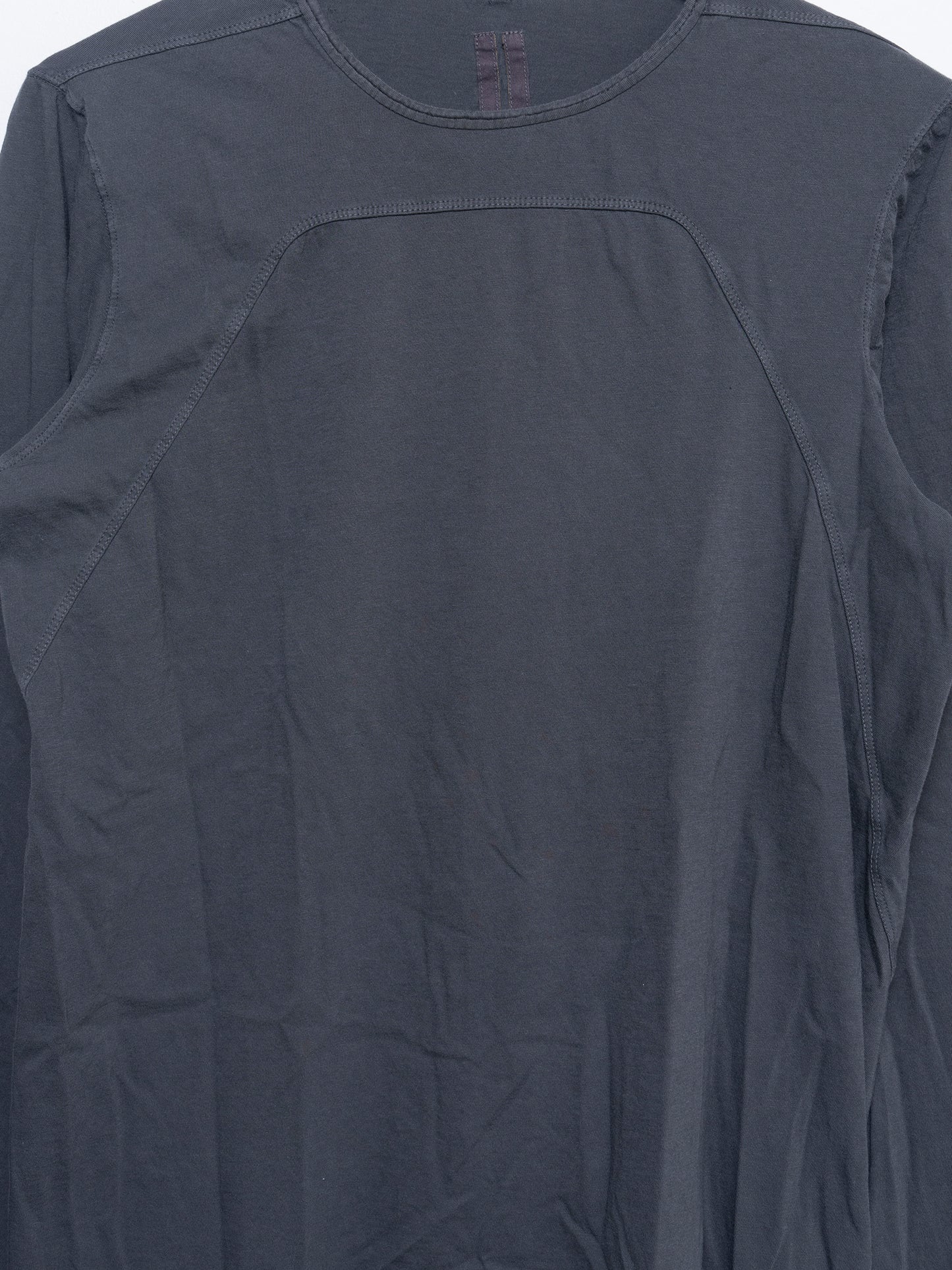 A grey long sleeve tee from Rick Owens with a paneling design on the chest to give it nice structure.