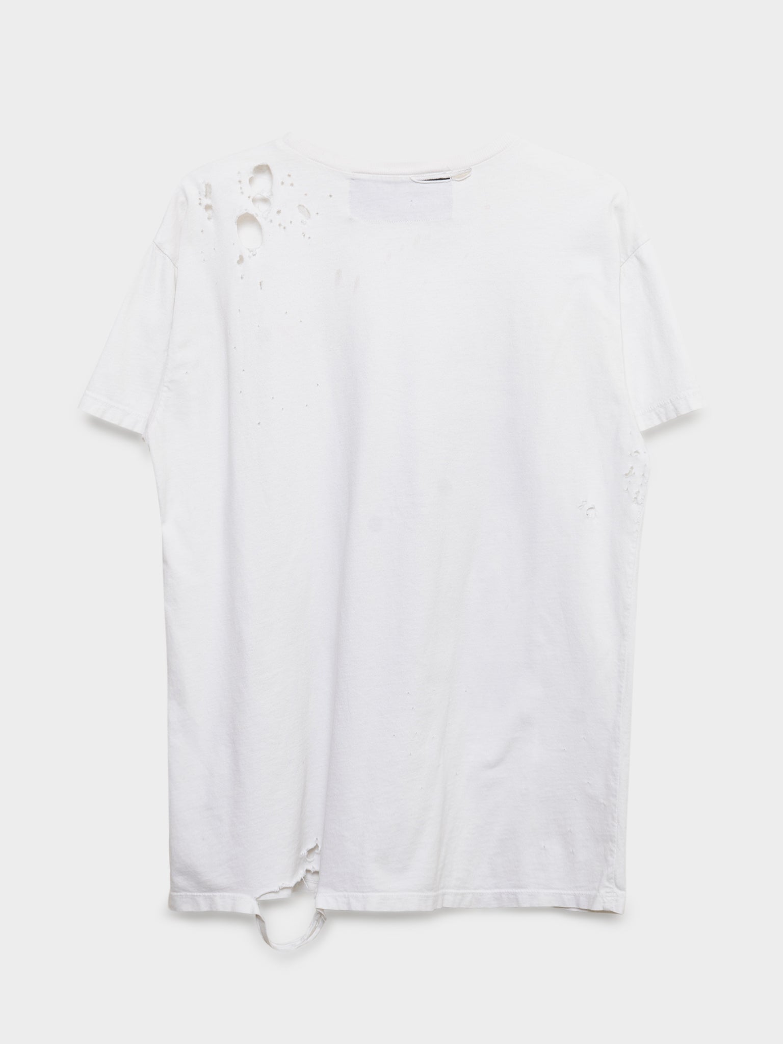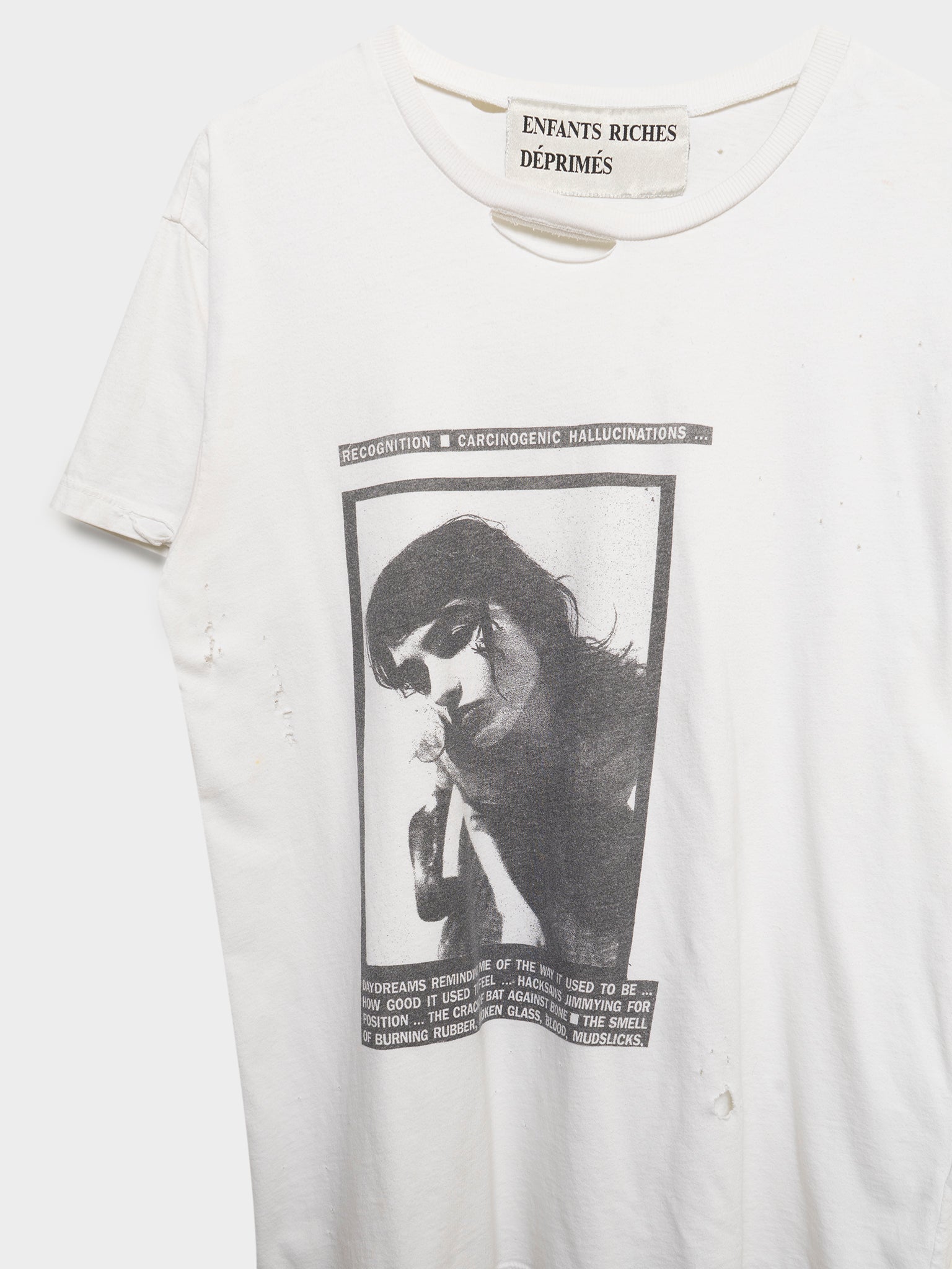 A distressed white tee from Enfants Riches Deprimes with a female figure and writing below discussing hallucinations