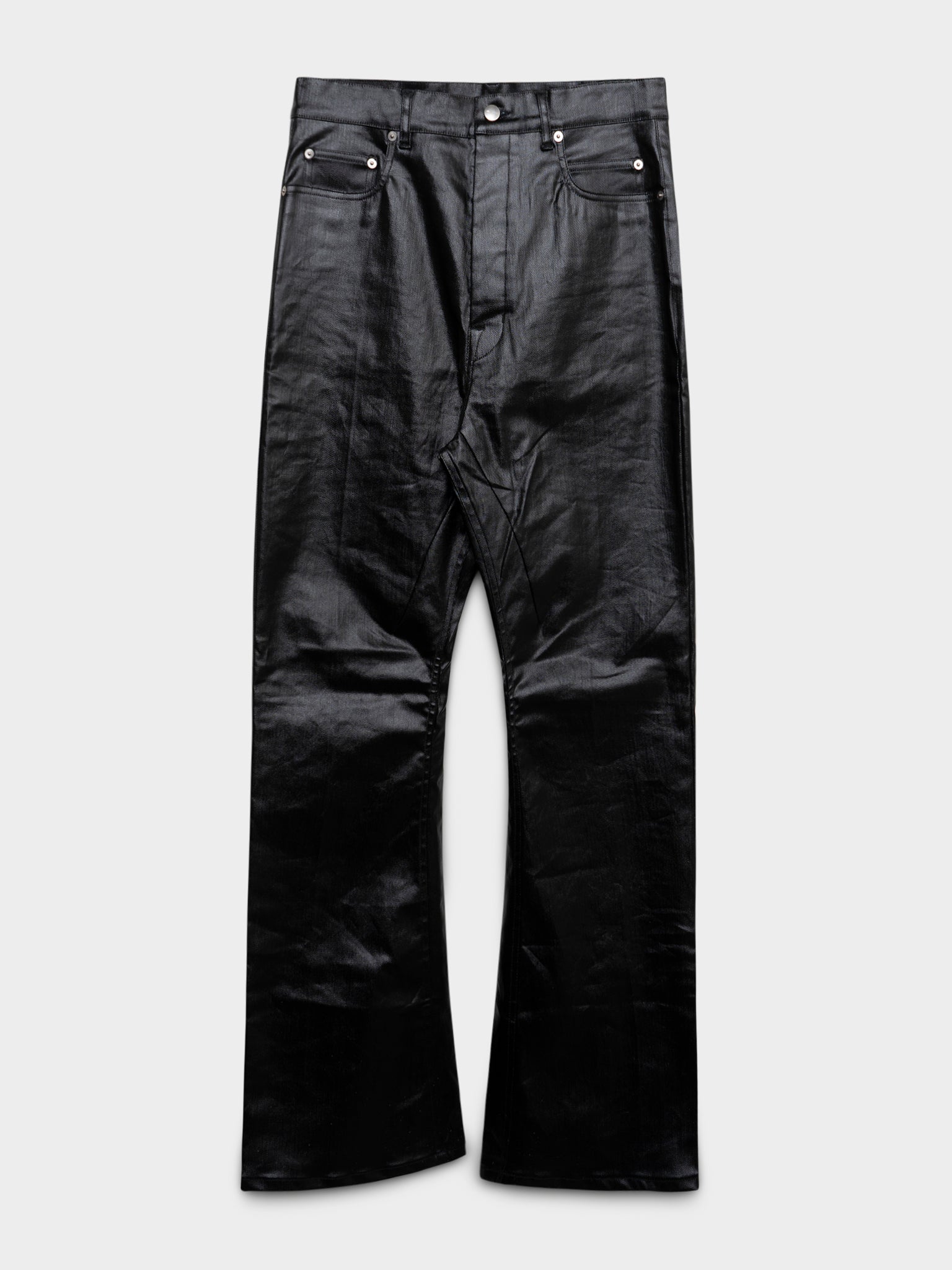 A pair of straight legged Rick Owens Hollywood pants with a shiny wax coating on the outside