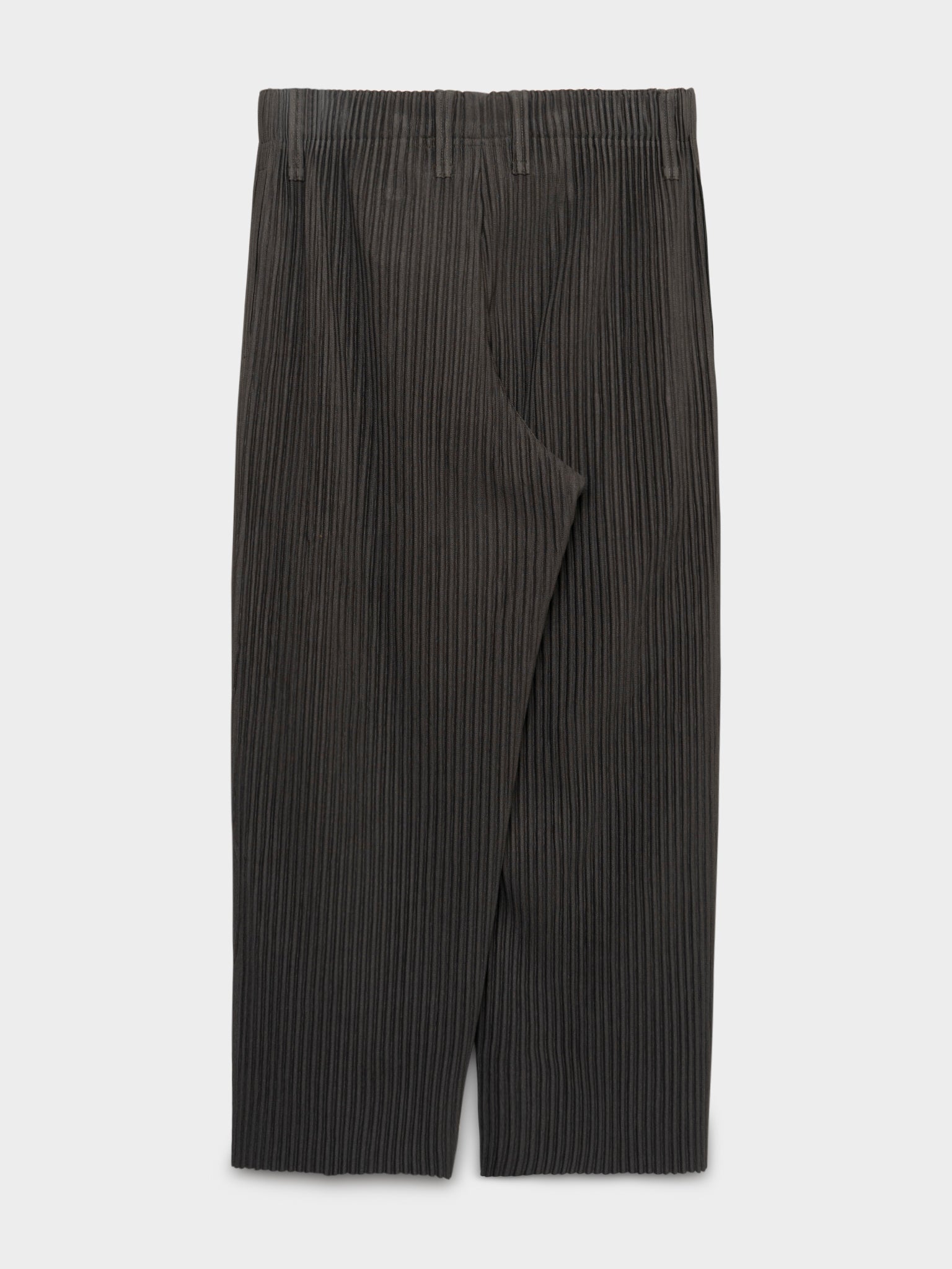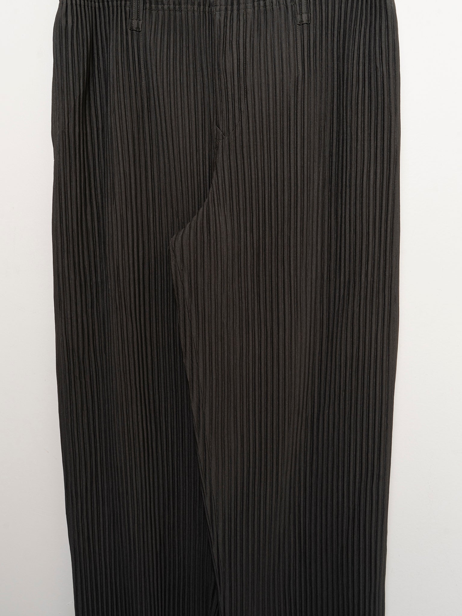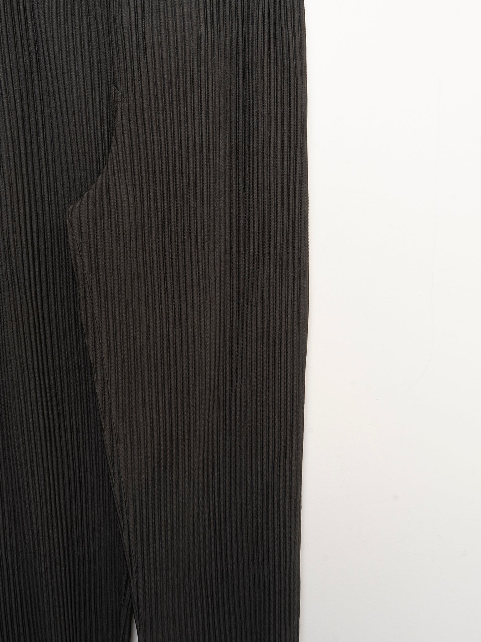 A pair of olive colored Issey Miyake Homme Plisse pleated pants with super elastic waist.