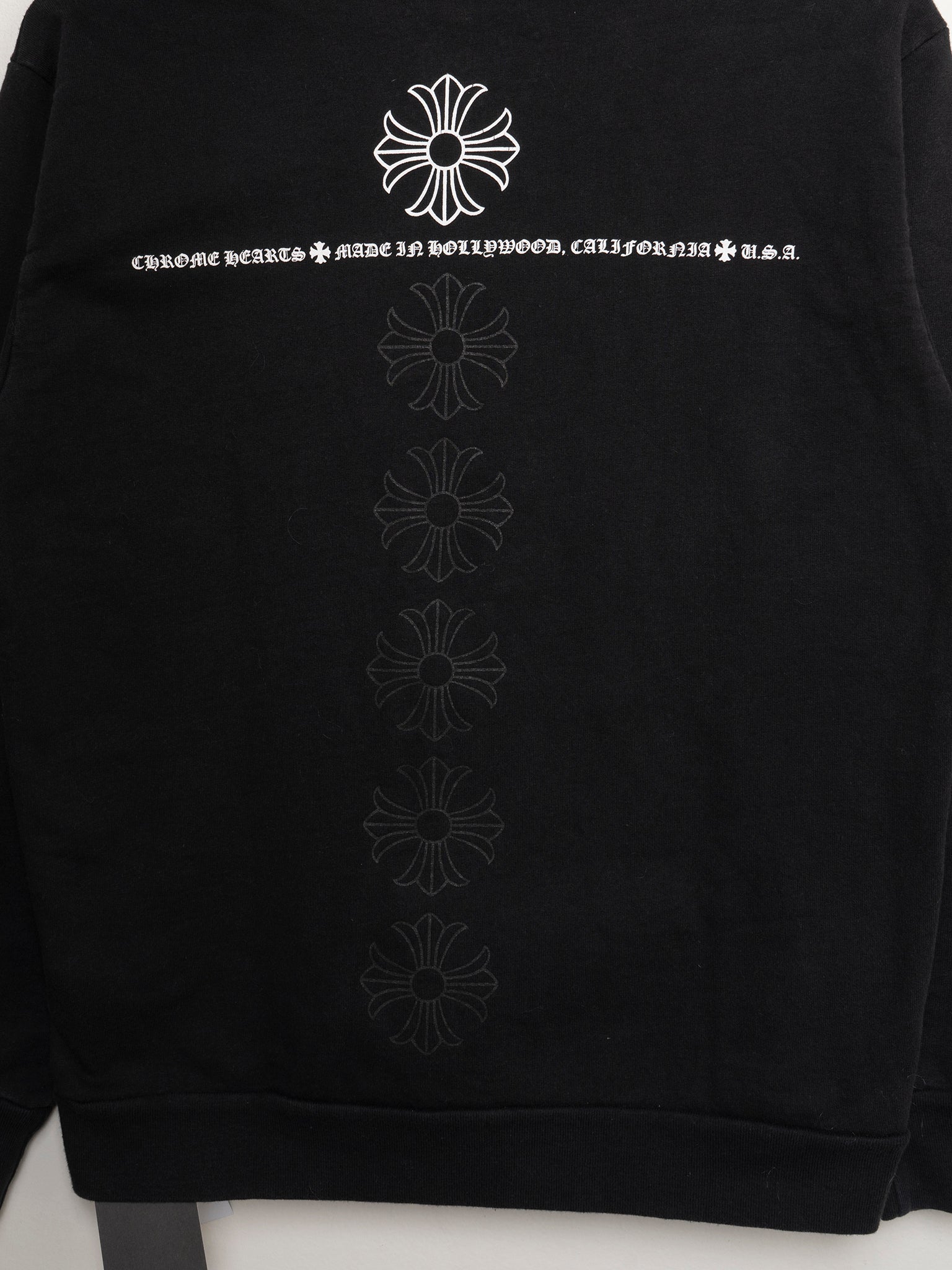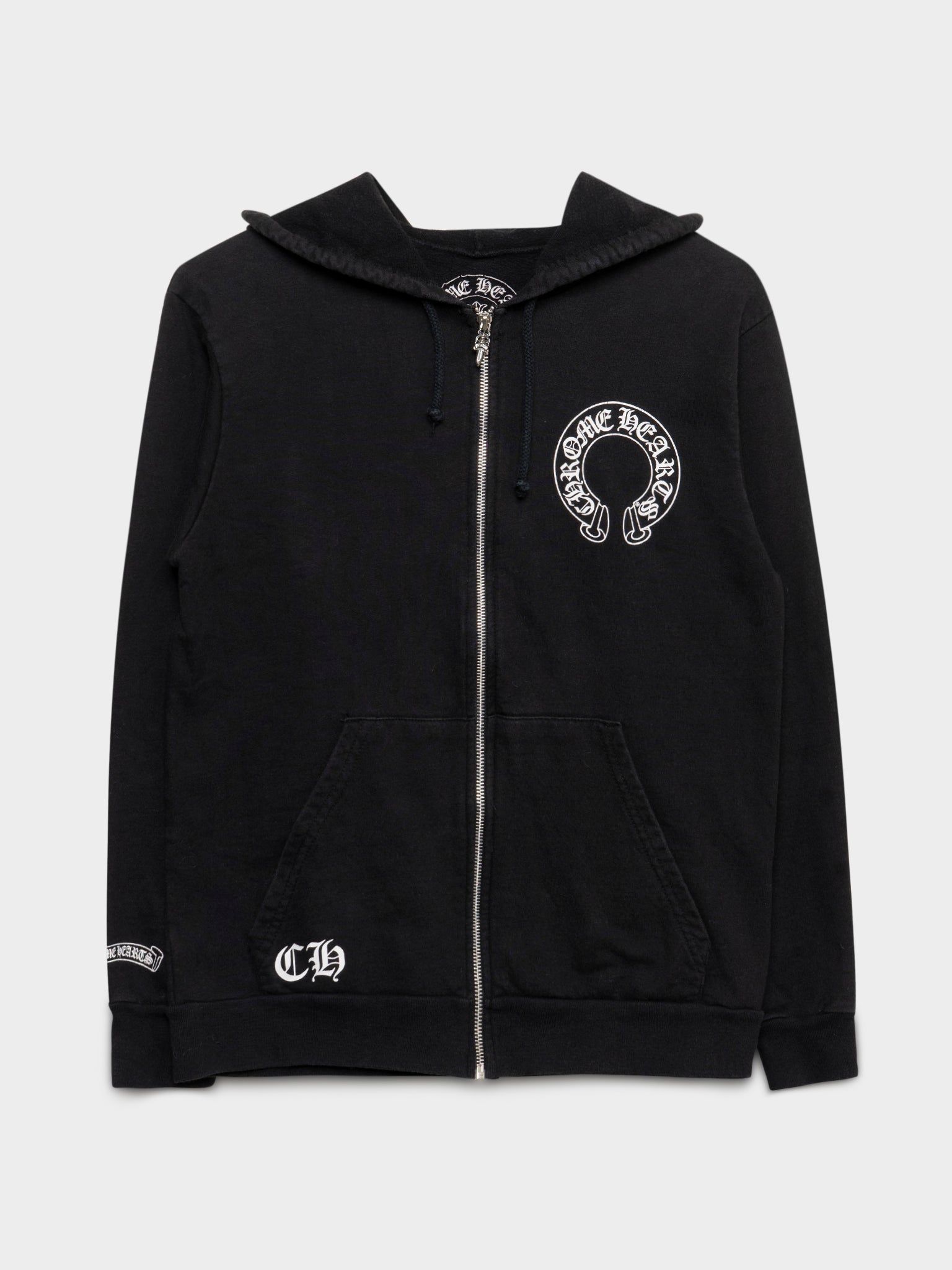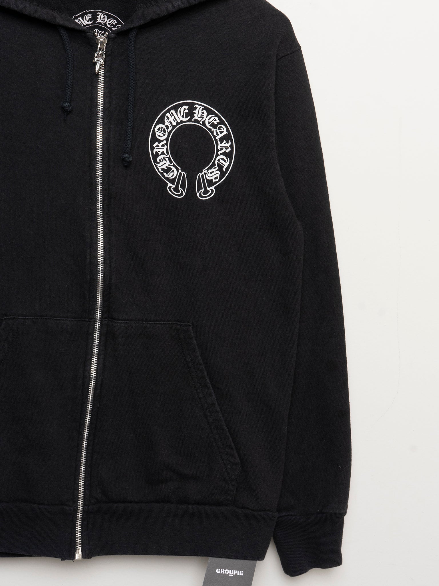 A black zip up Chrome Hearts hoodie with horseshoe on the chest and plus signs down the spine.