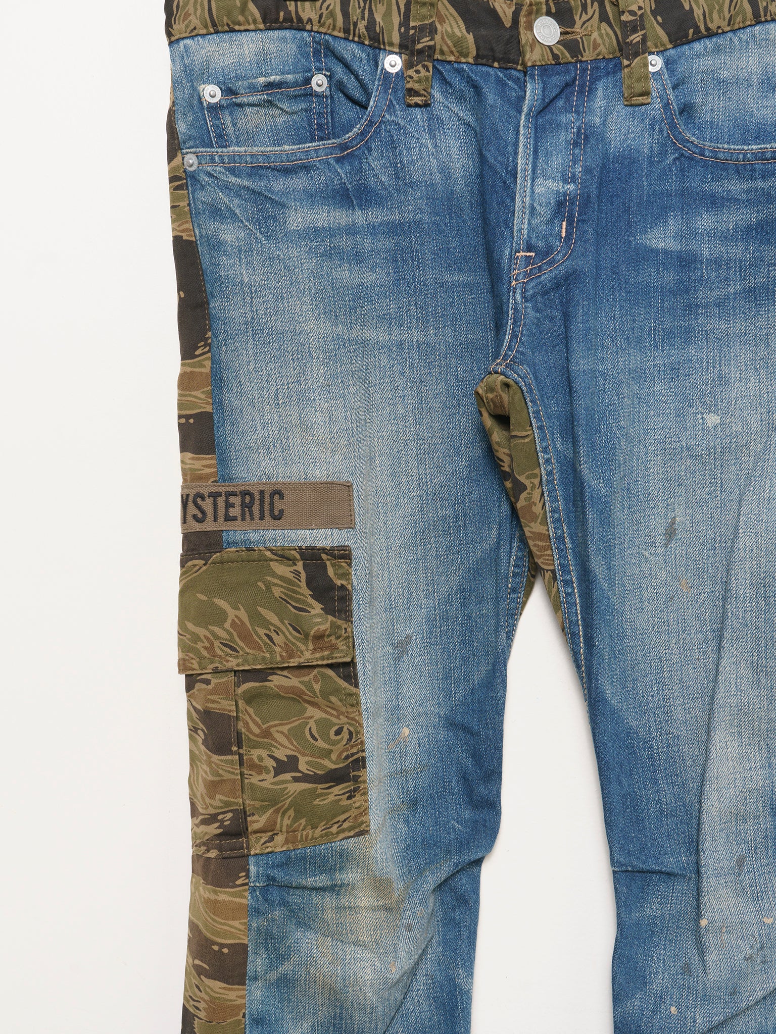 A pair of Hysteric Glamour cargo pants that are a denim/camo hybrid.