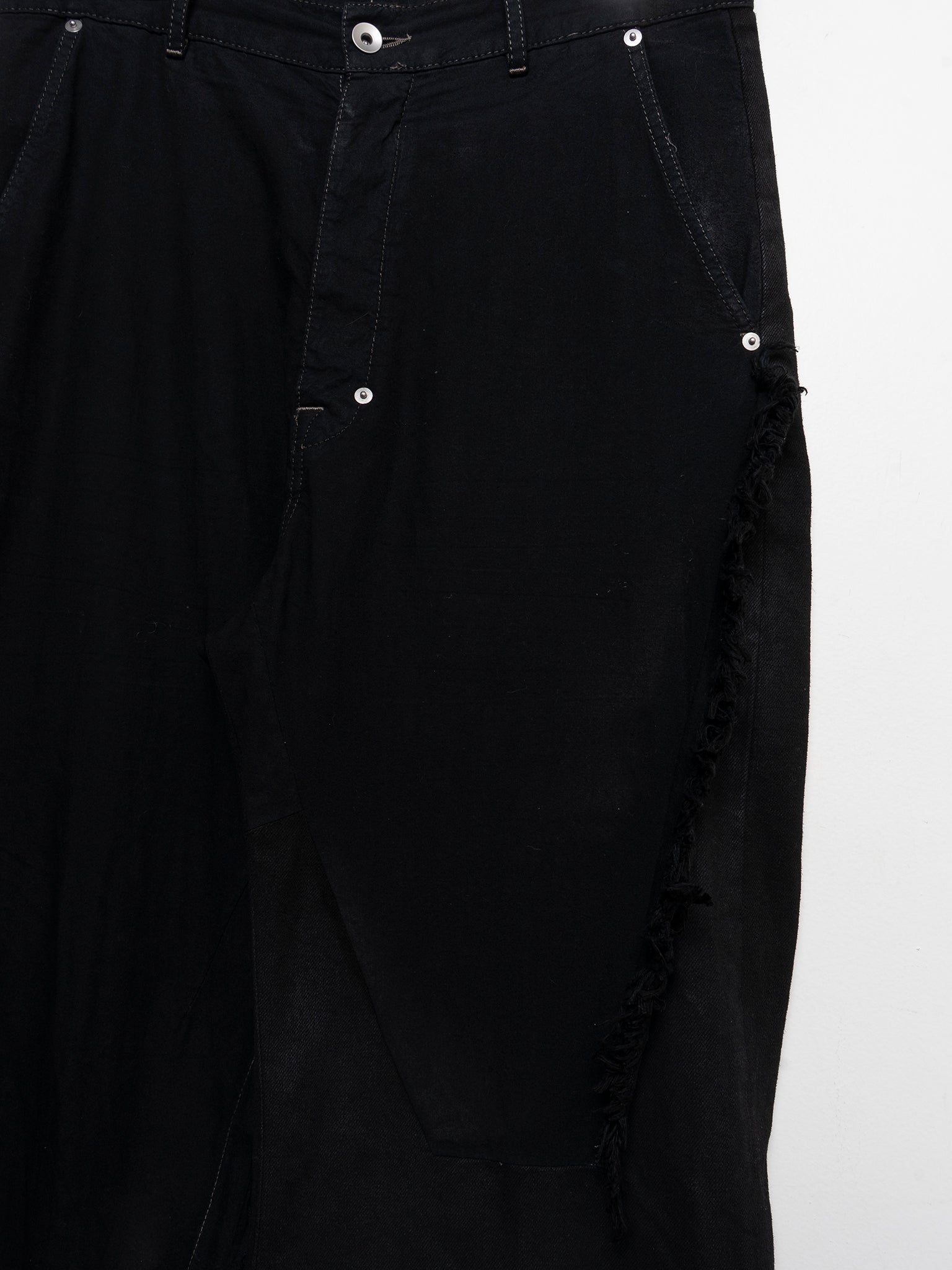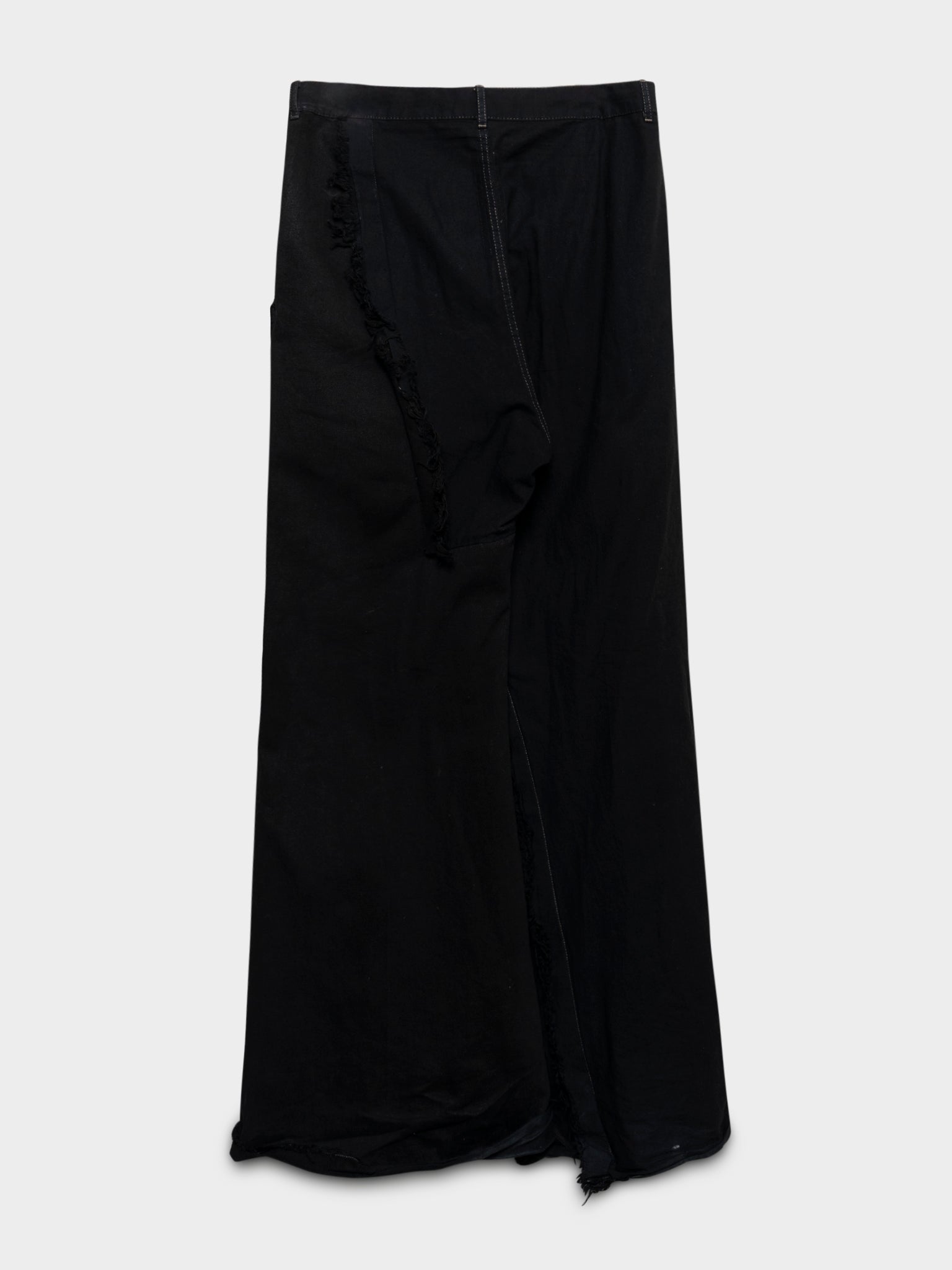 A pair of extremely wide legged Rick Owens Joris cut jeans with distressing along the hems