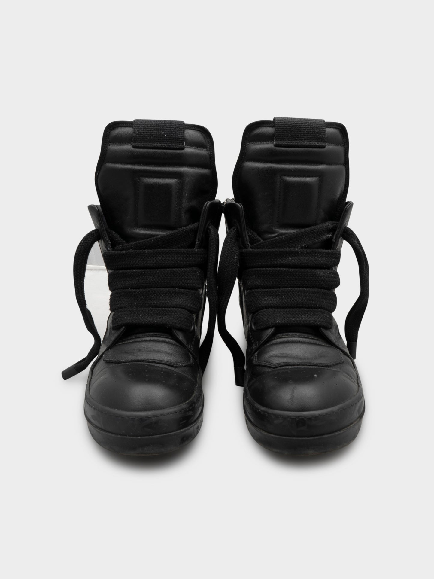 A pair of all black Rick Owens Geobasket sneakers with the extra wide jumbo laces.