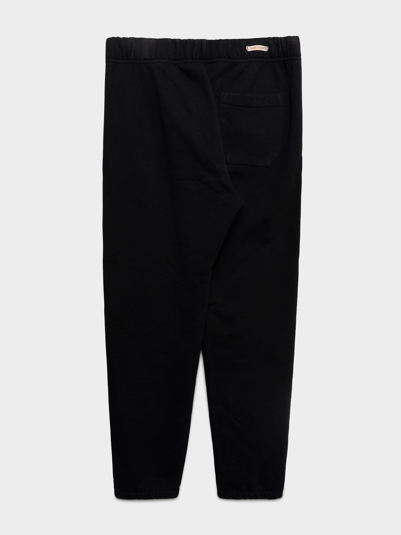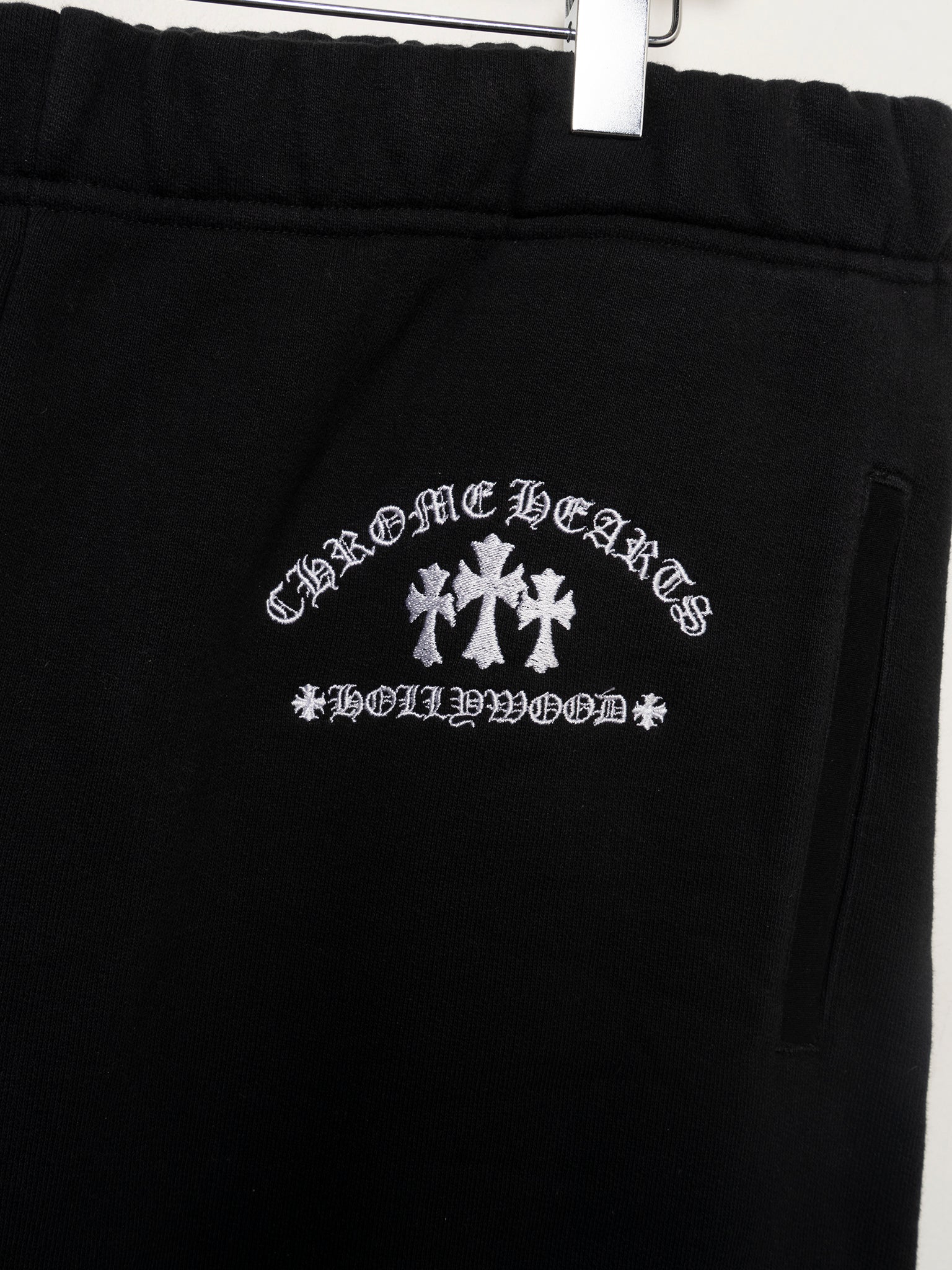 A pair of heavyweight black Chrome Hearts sweatpants with triple embroidered crosses on the thighs
