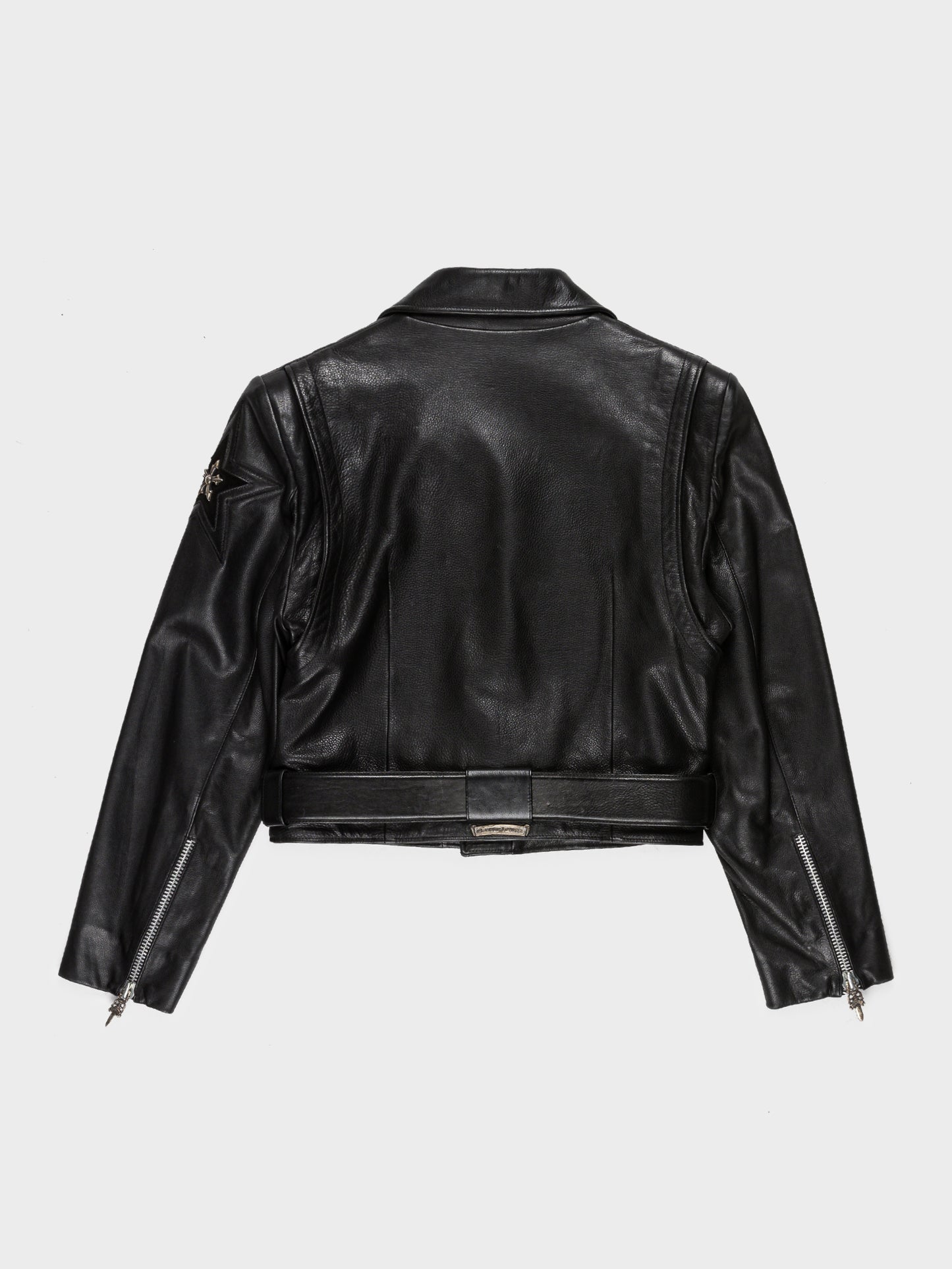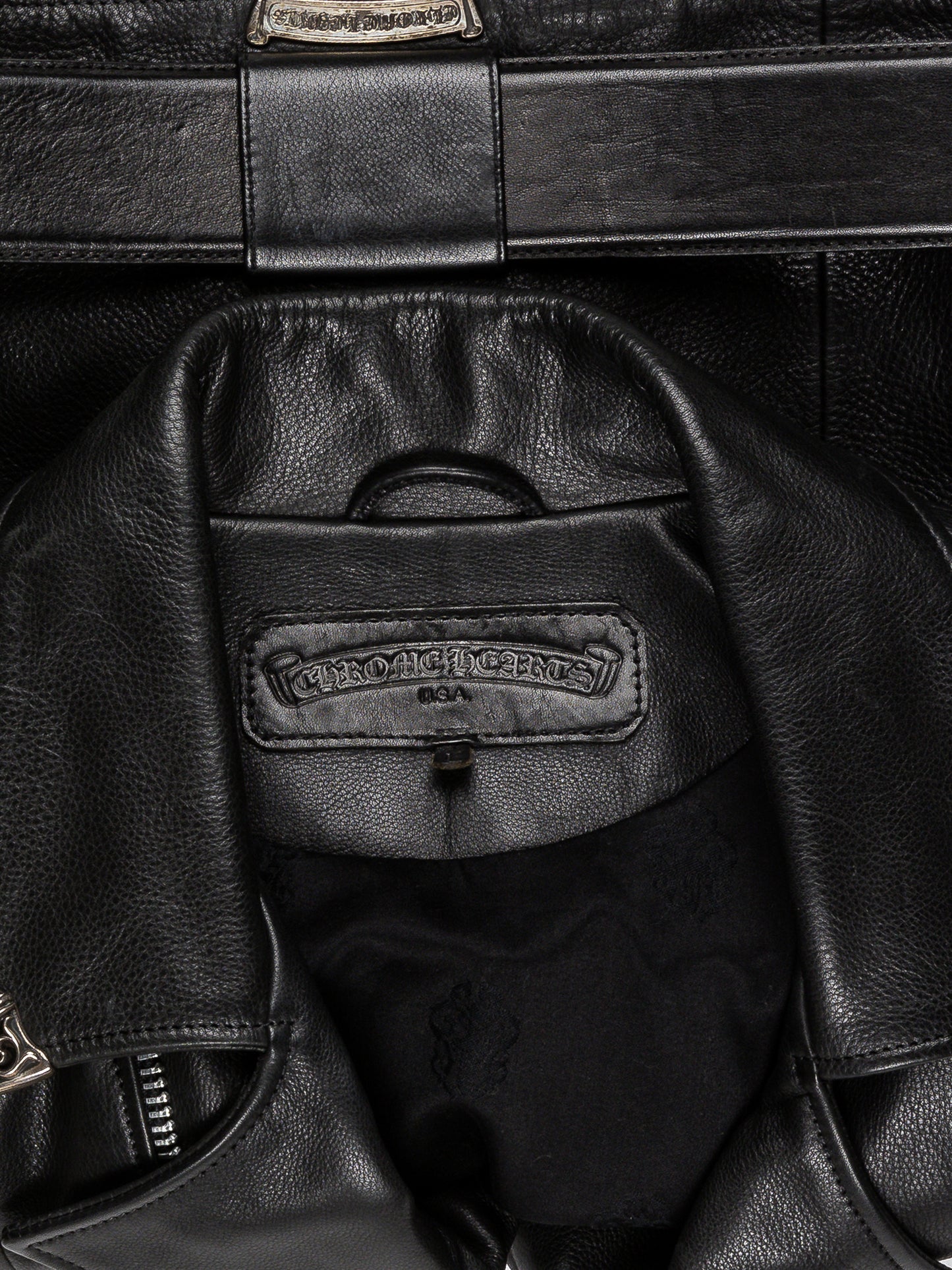 A thick leather jacket from Chrome Hearts with all the classic biker jacket details, except of course in sterling silver as Chrome Hearts does.