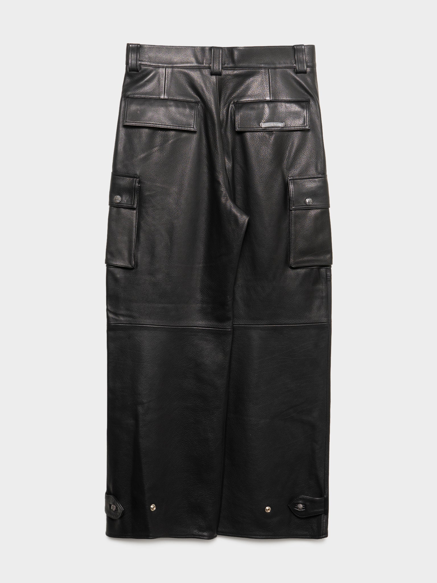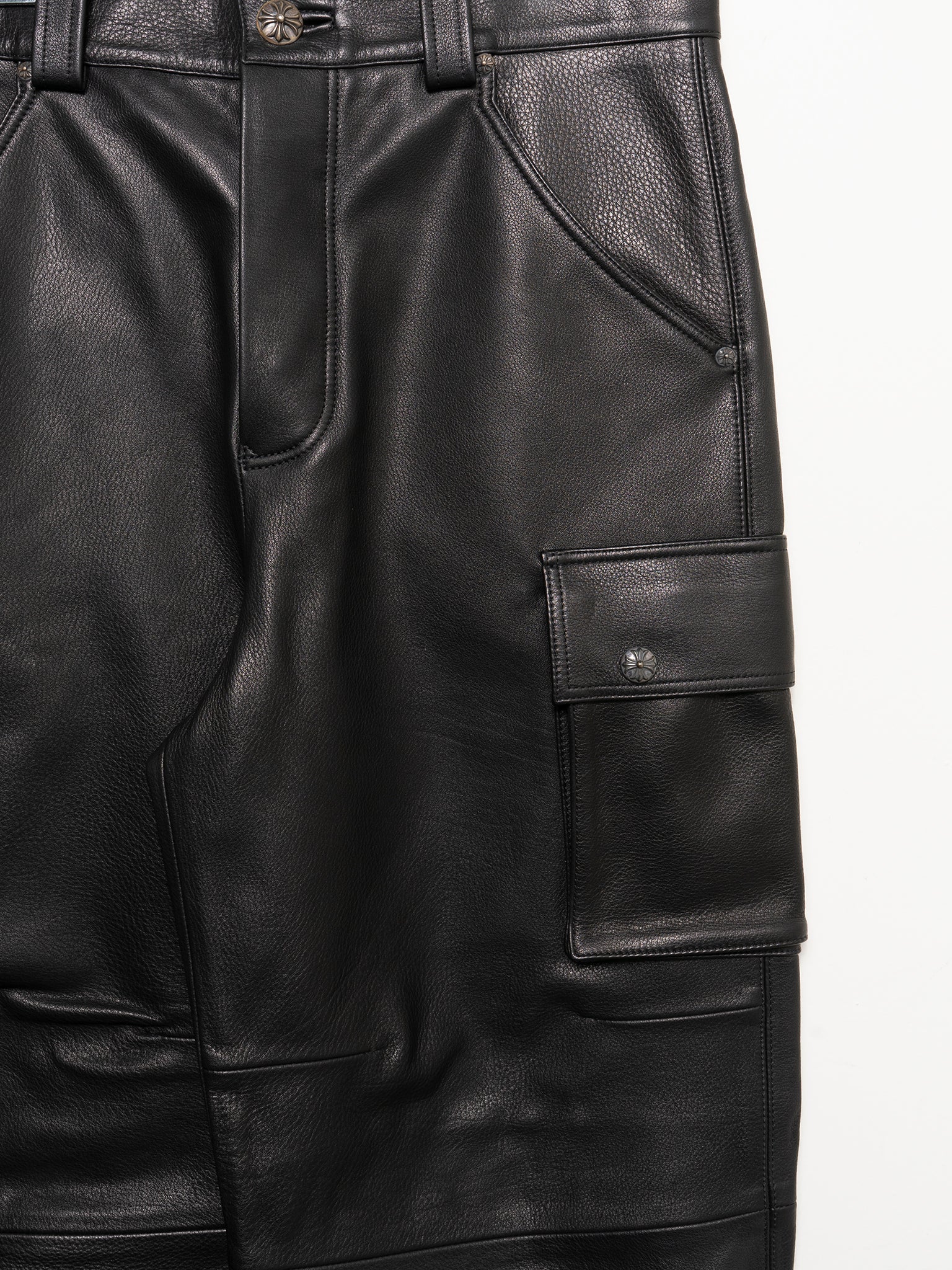 A pair of hefty leather Chrome Hearts pants with large side cargo pockets and sterling silver hardware
