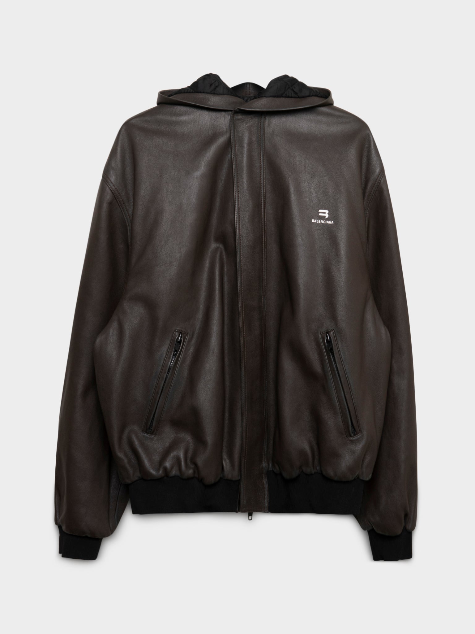 An oversized brown leather Balenciaga bomber with built in hood and sporty B logo on the chest.