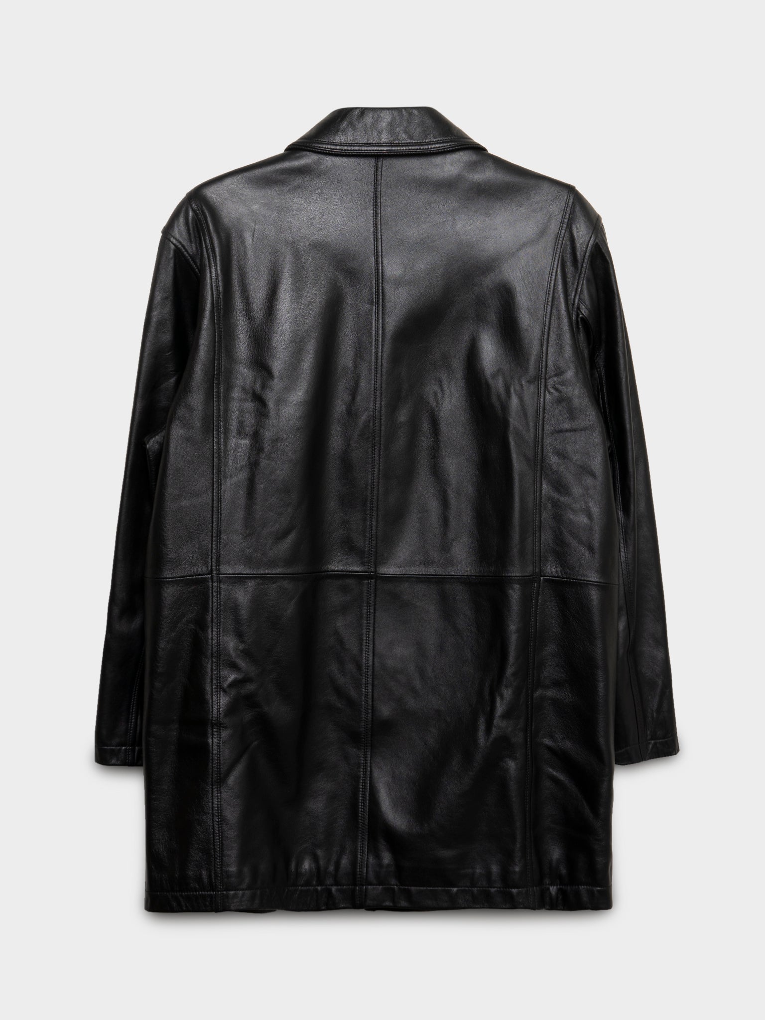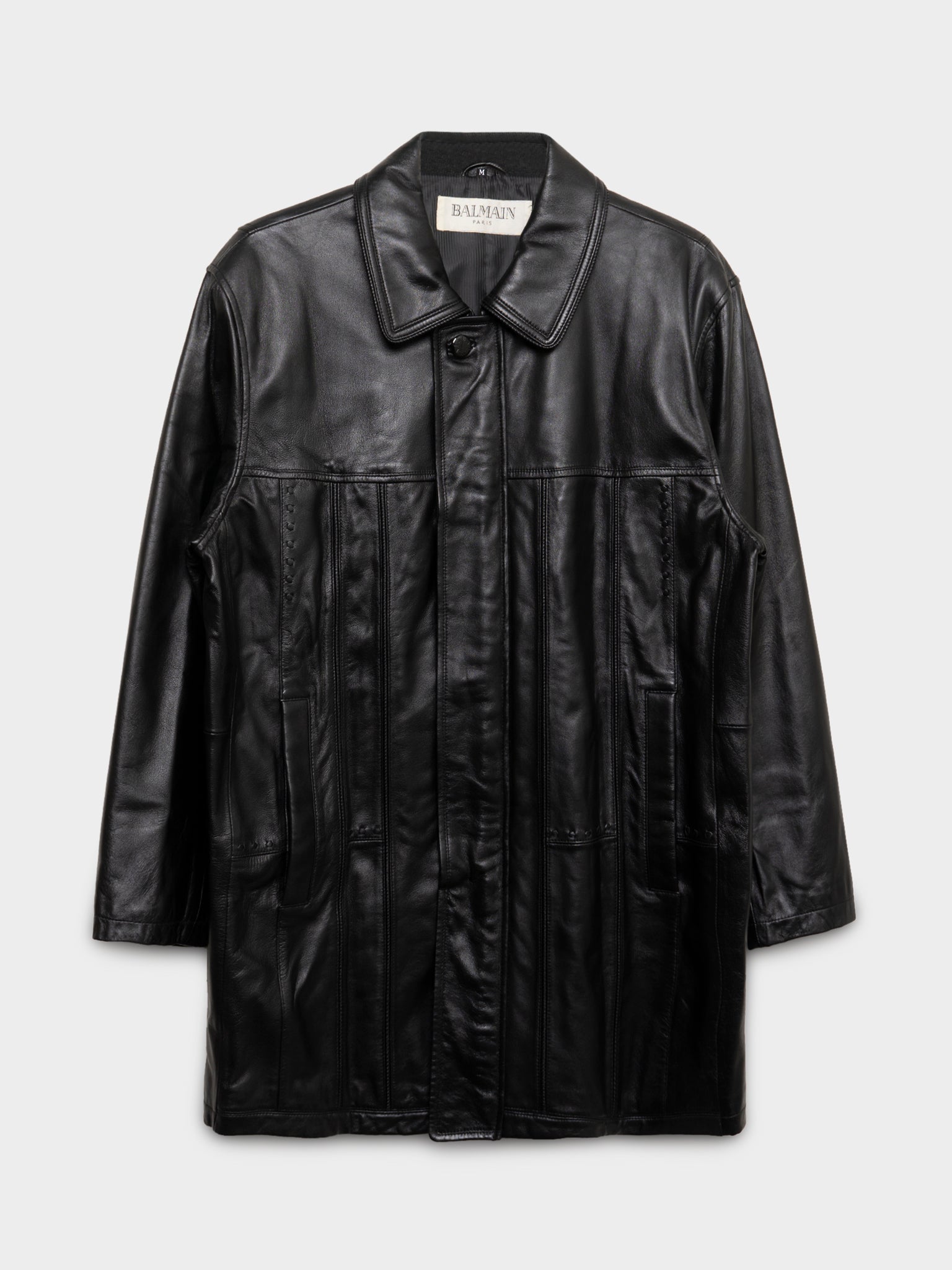 A buttery black leather coat from Balmain with seams running up the front