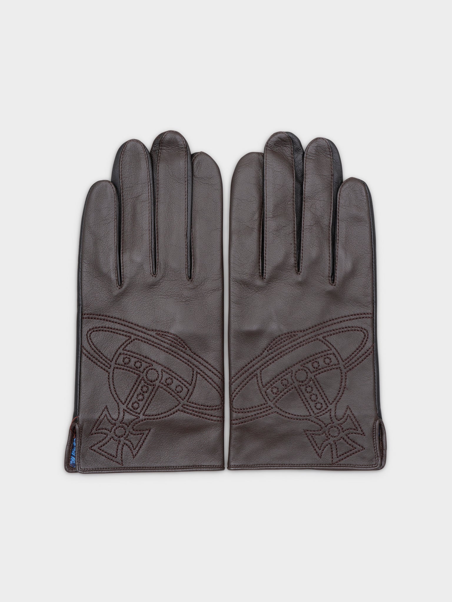 A pair of brown leather Vivienne Westwood gloves with embroidered orb designs on both hands.