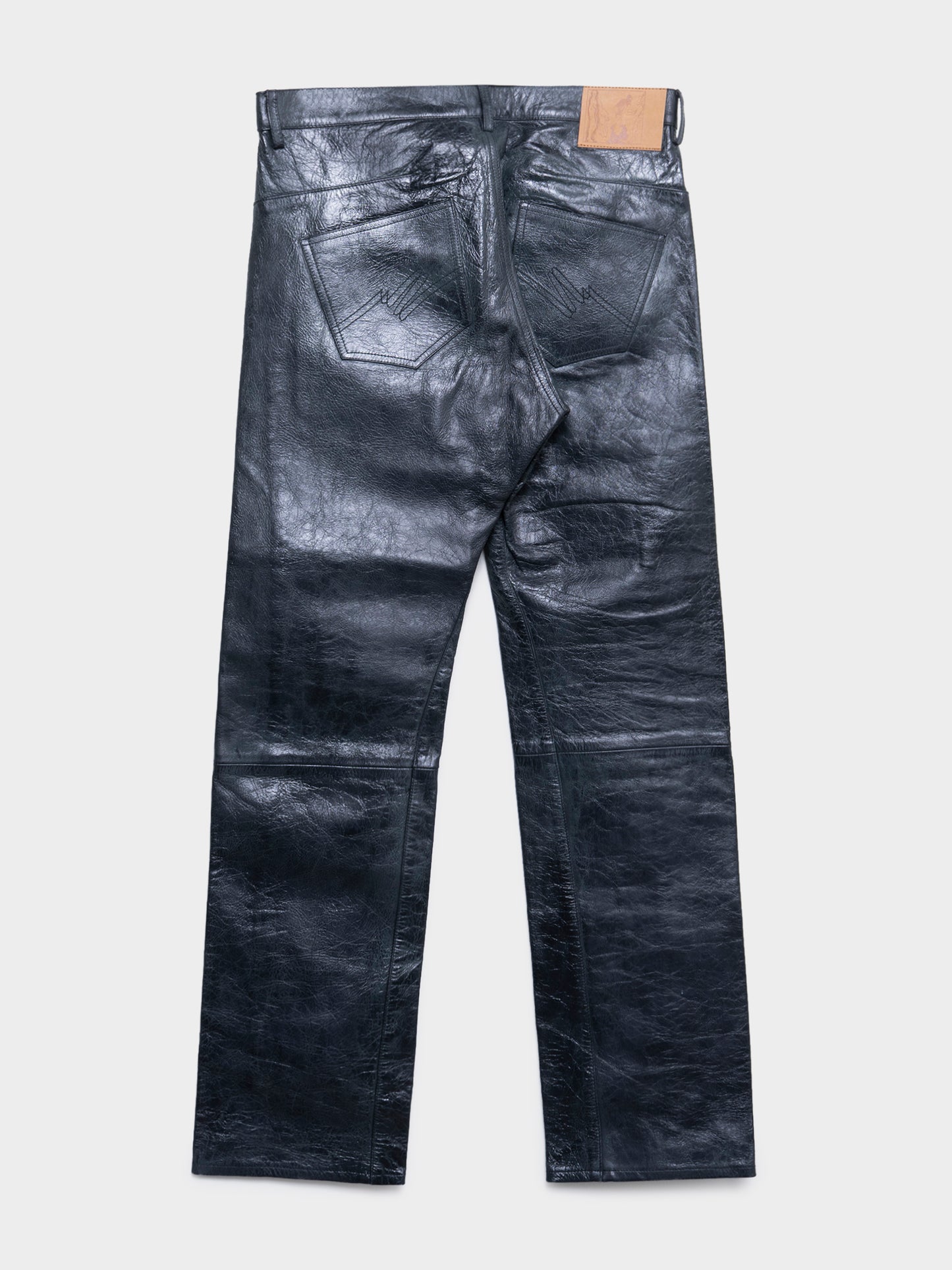 A pair of straight legged biker style leather pants from Martine Rose with subtle knee paneling.