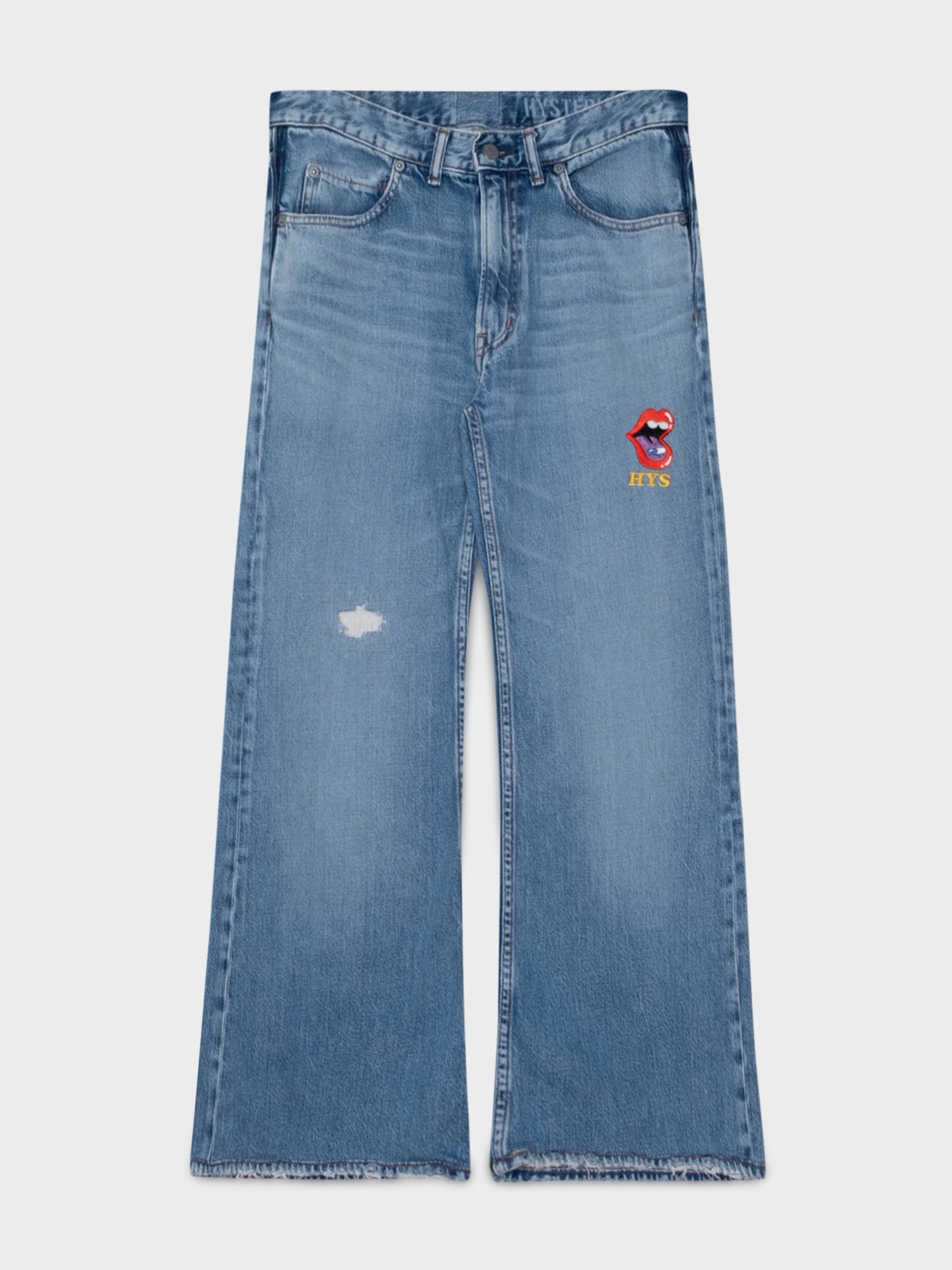 A pair of Hysteric Glamour flared jeans with red lips and HYS on the thigh