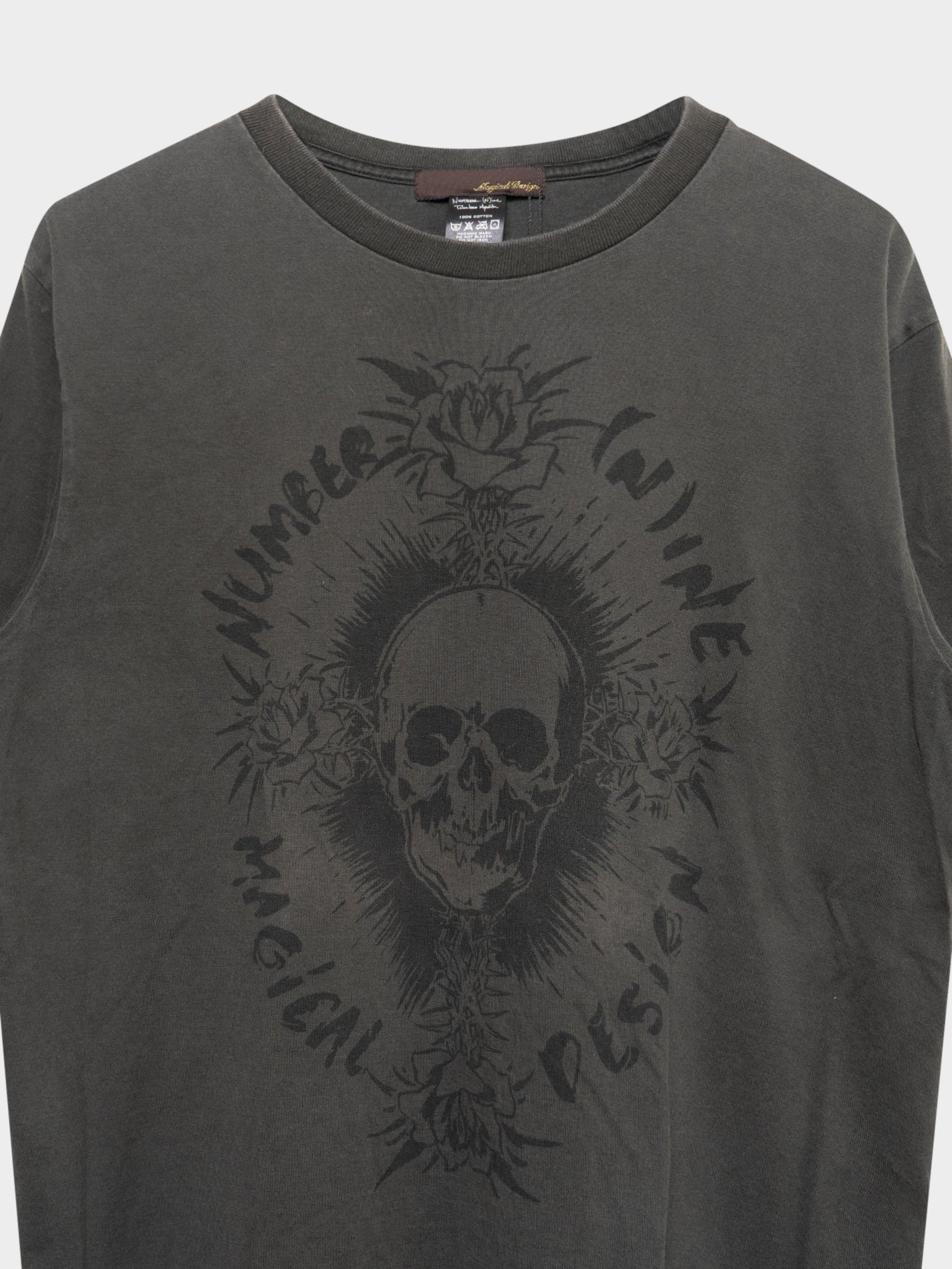 A faded grey Number (N)ine tee with a skeleton on the front and the words 'Magical Design' around it.