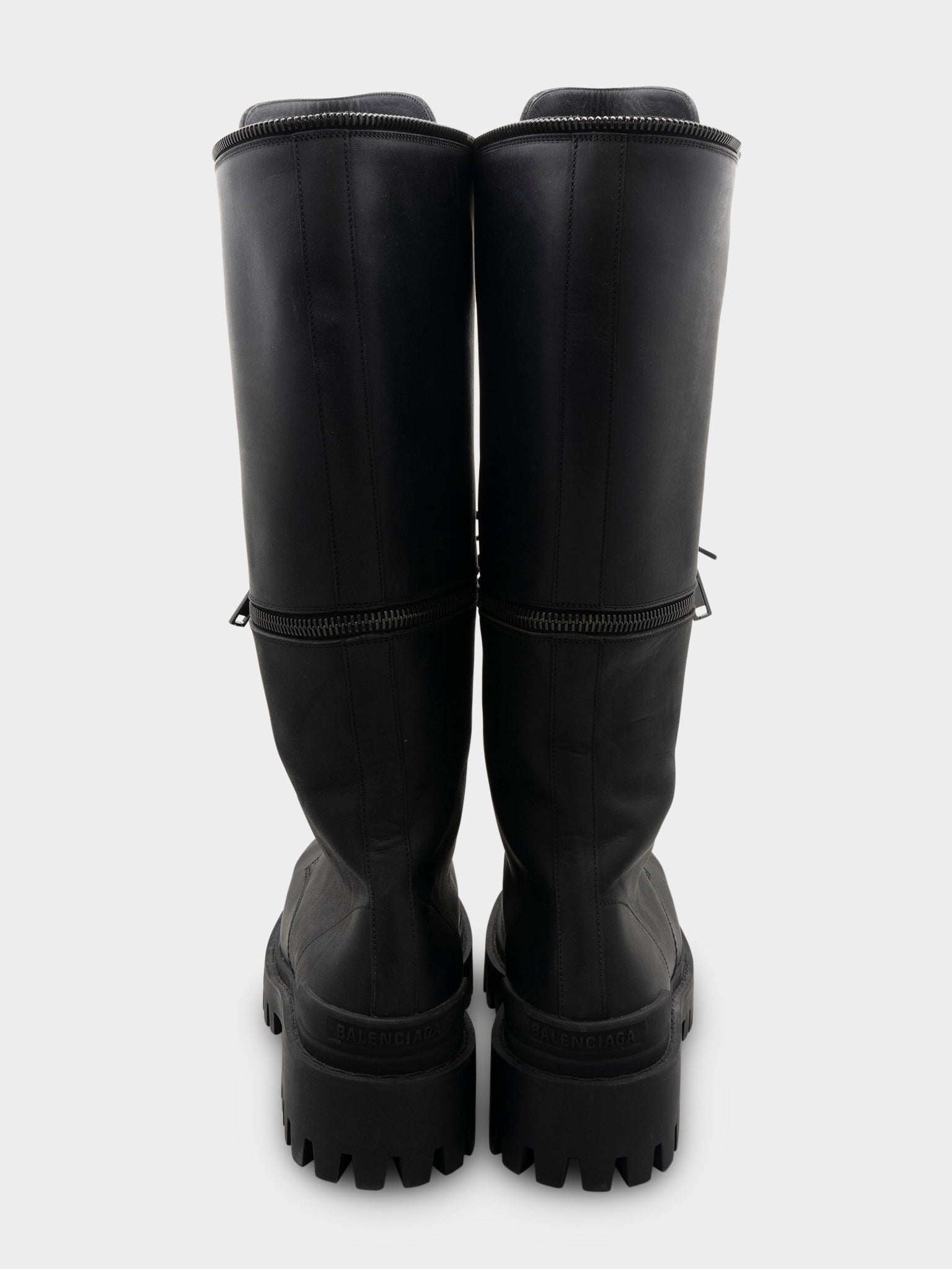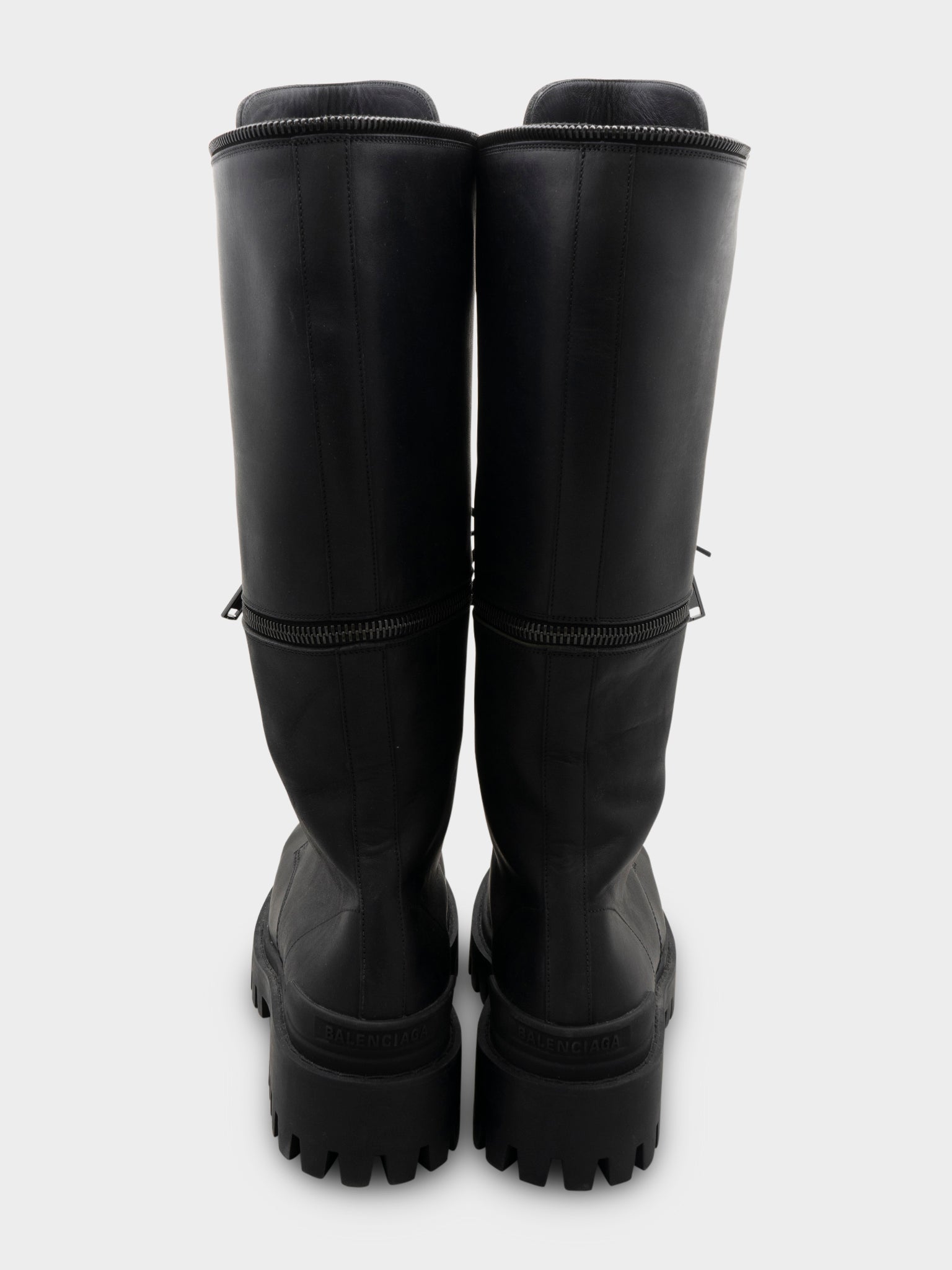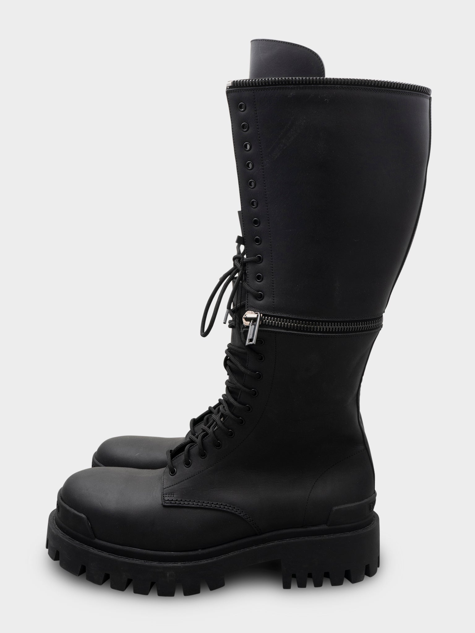 A pair of real serious stompers, the Balenciaga Master boots, a tall pair of combat boots with zippers half way up