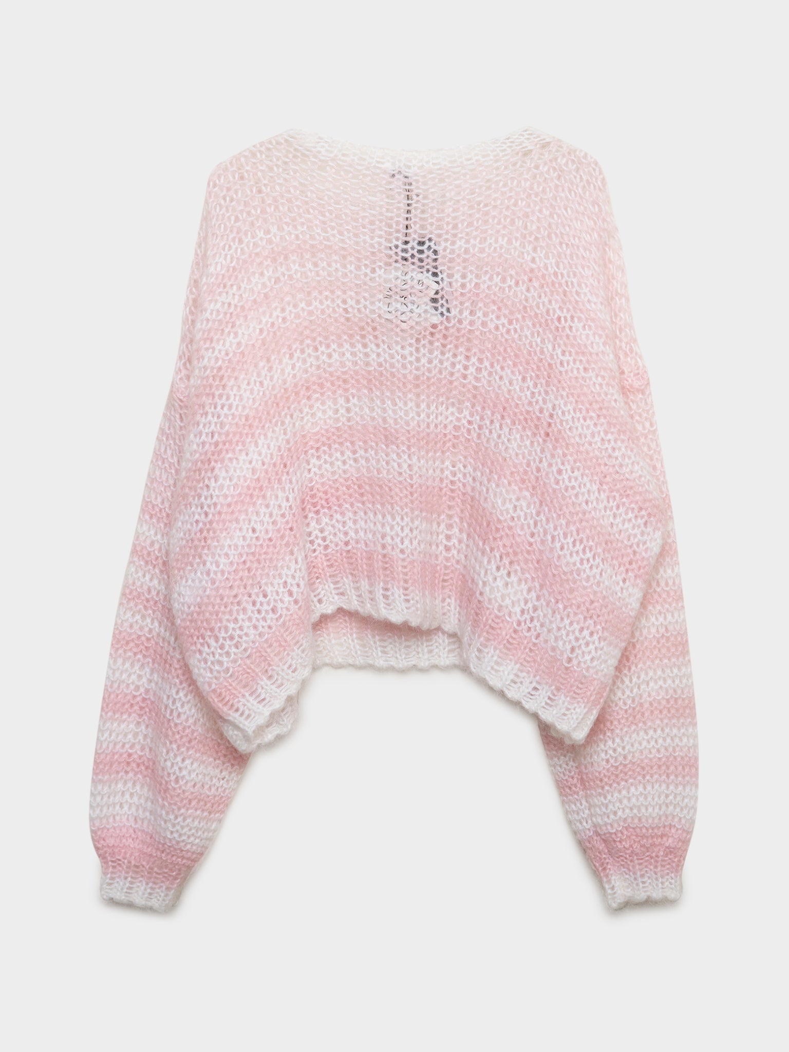A light pink and white colored mohair sweater from Loewe with their logo largely embroidered on the front.