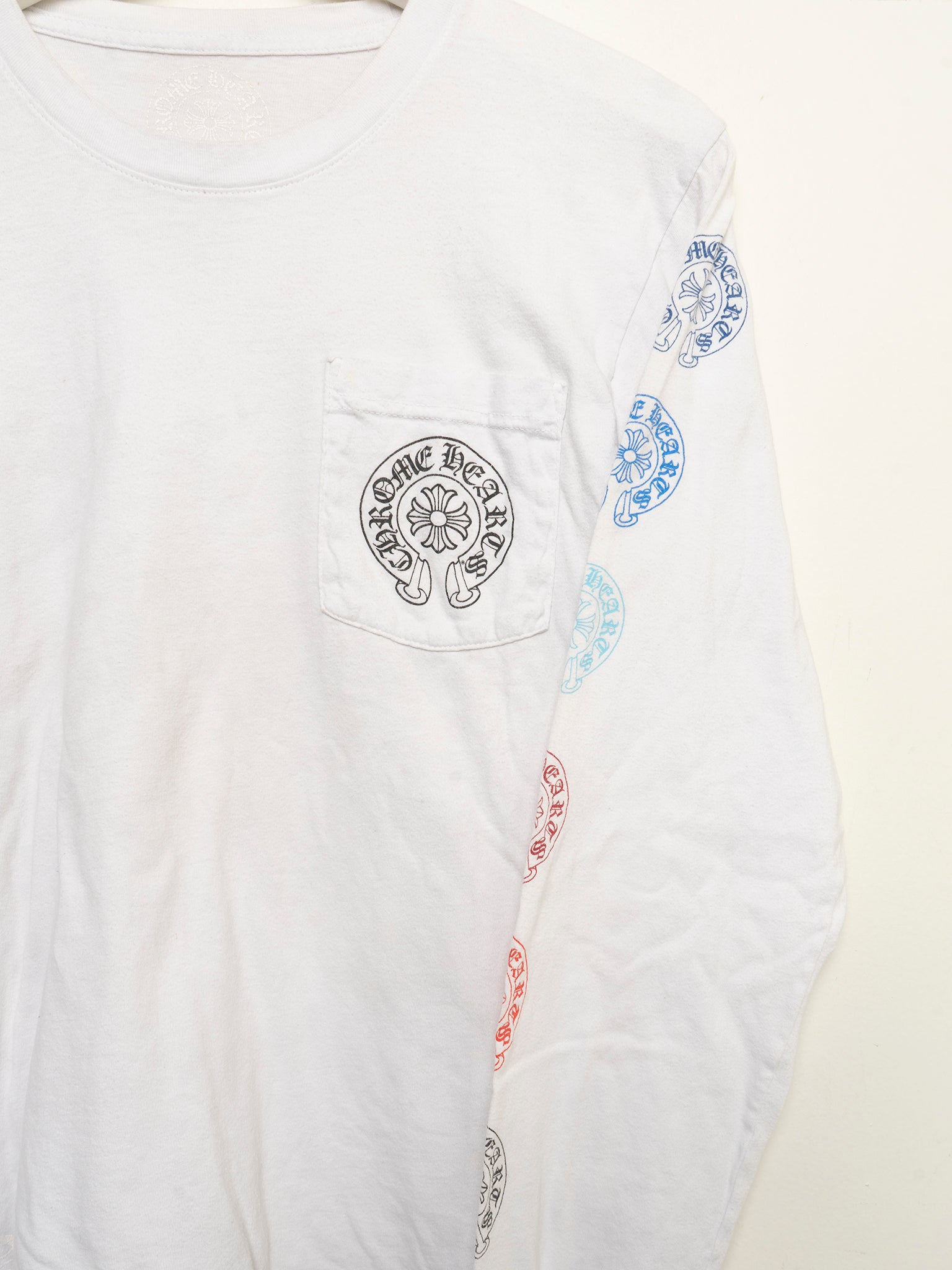 A white Chrome Hearts longsleeve tee with horseshoes running down the sleeves in an assortment of colors.