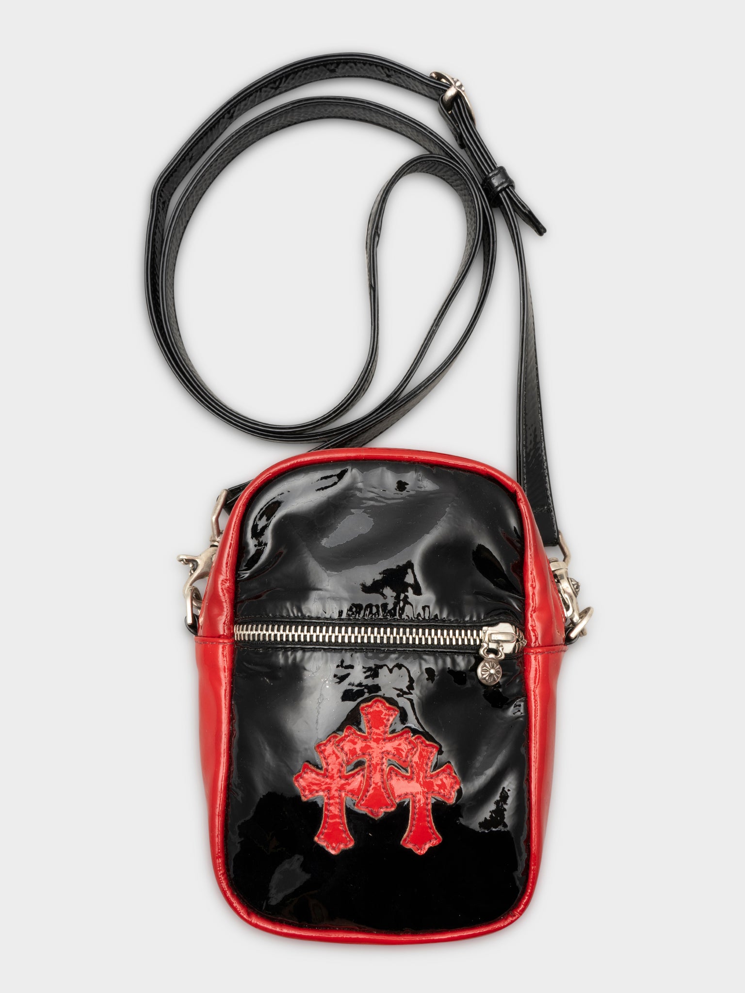 A black patent leather Chrome Hearts Taka bag with red trim and leather cross patches