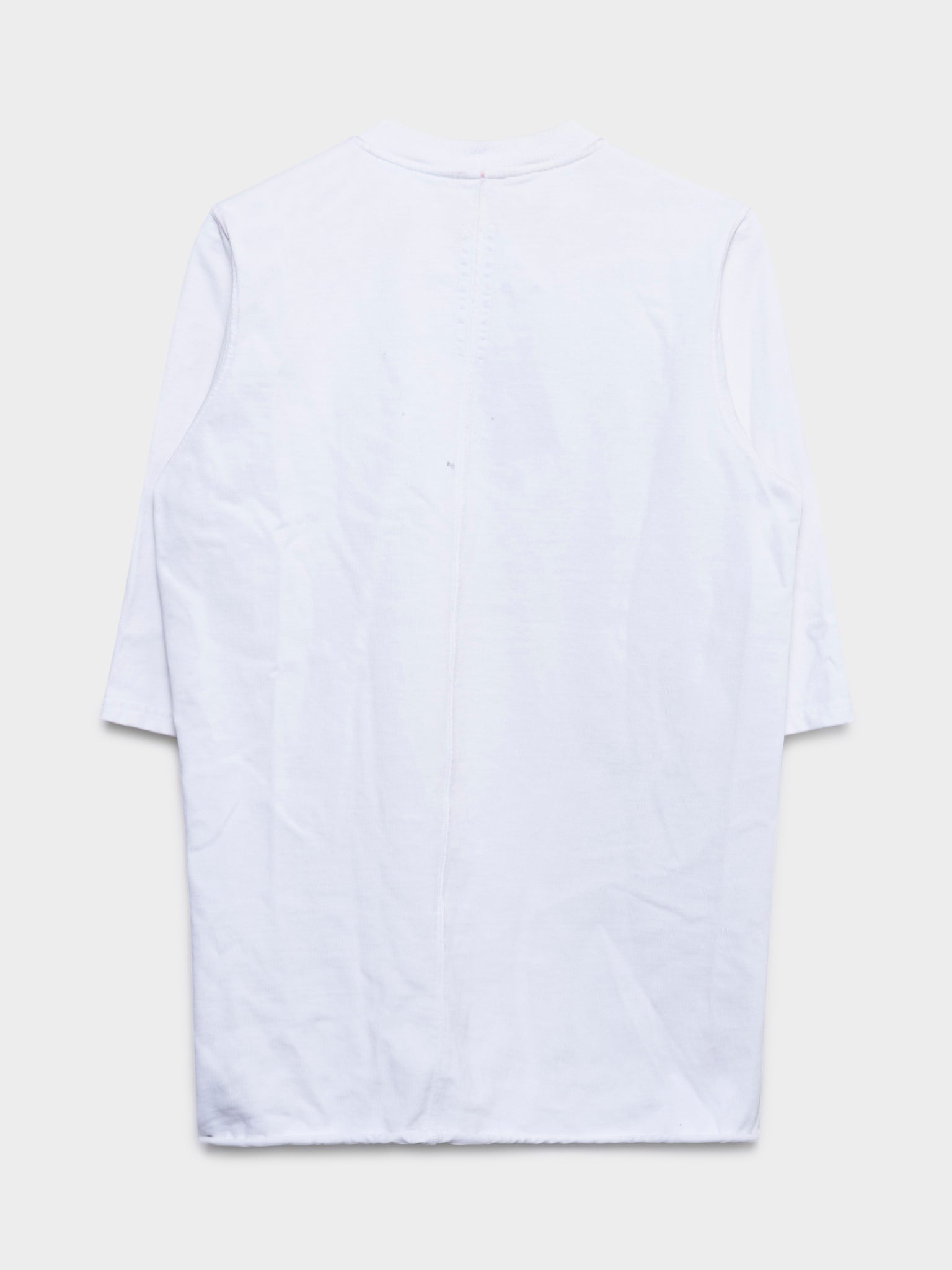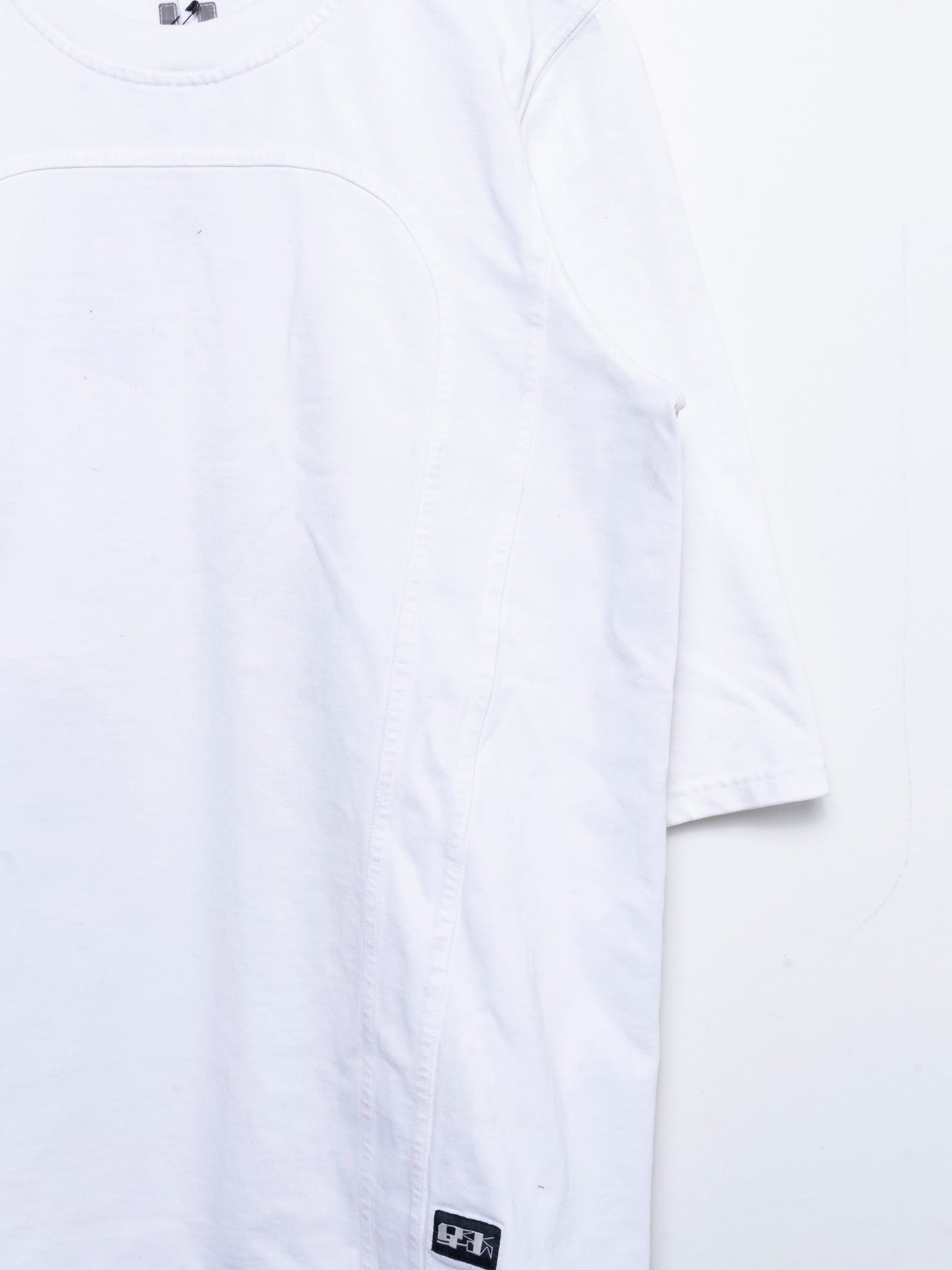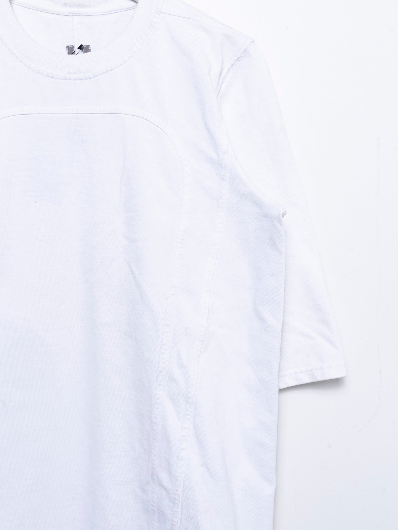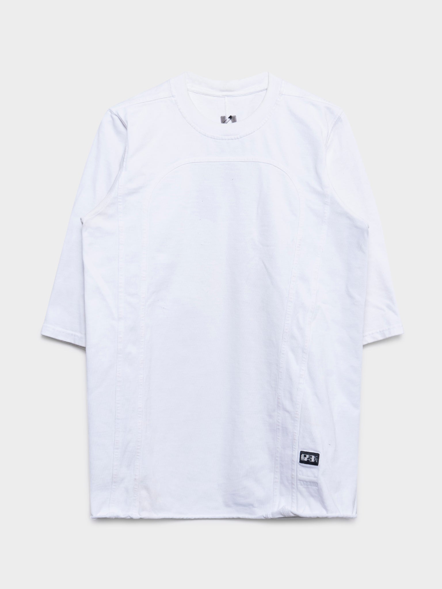 A heavy plain tee from Rick Owens with chest paneling in the color Milk.
