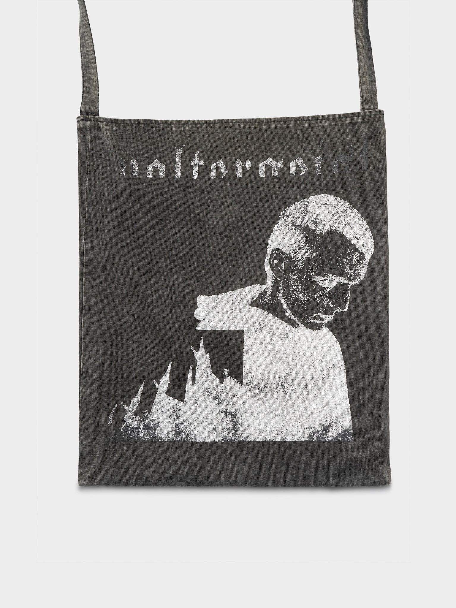 A faded grey Raf Simons tote bag from their AW05 collection that features the iconic poltergeist graphics.