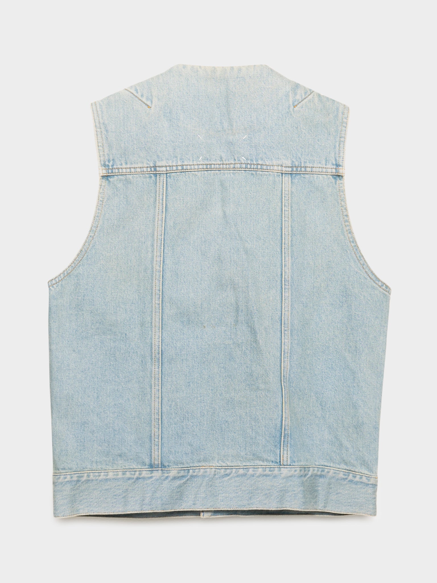 A light wash Margiela denim vest created of repurposed denim scraps.
