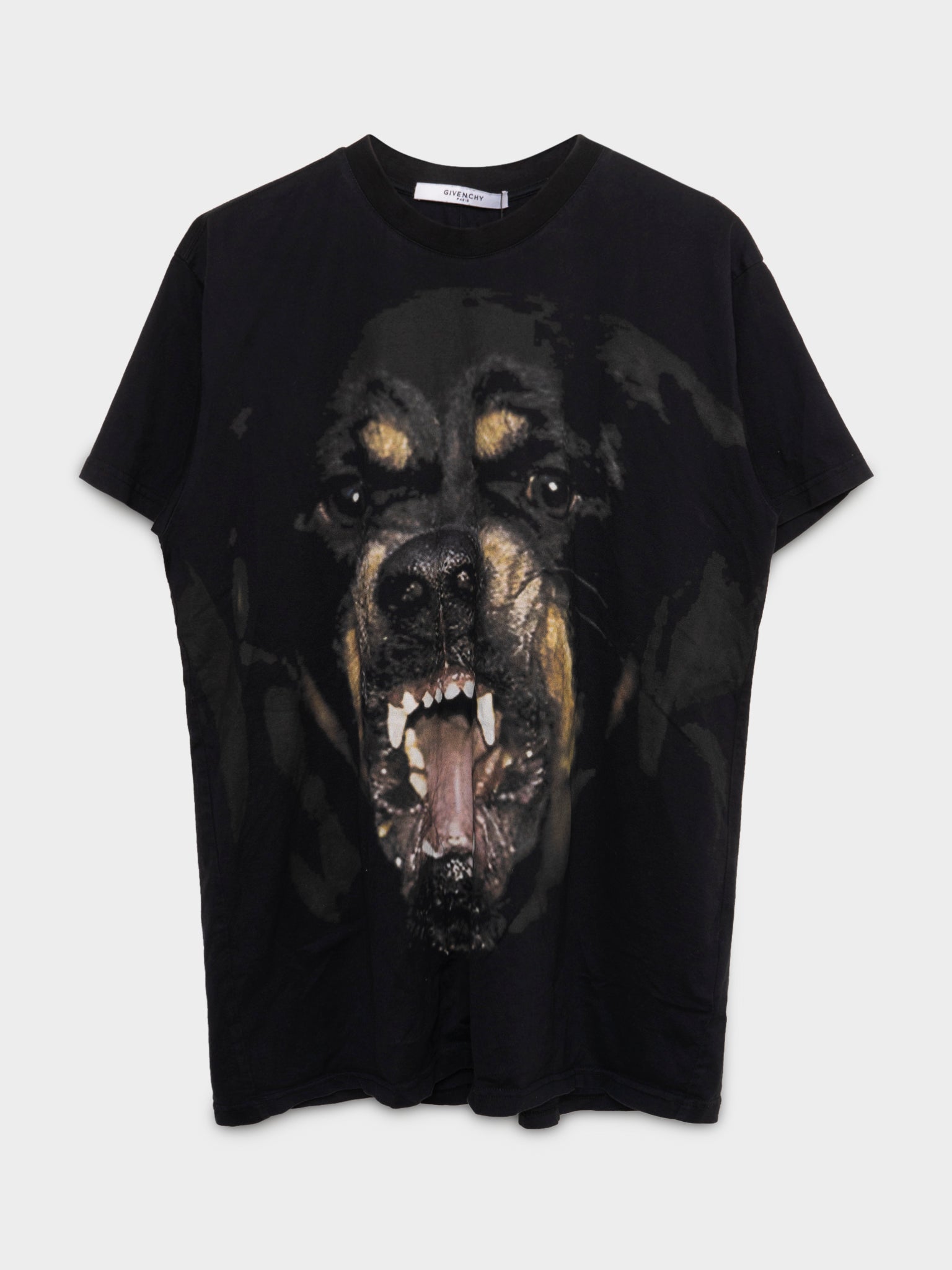 A black tee from Tisci-era Givenchy with their large iconic Rottweiler graphic on the front