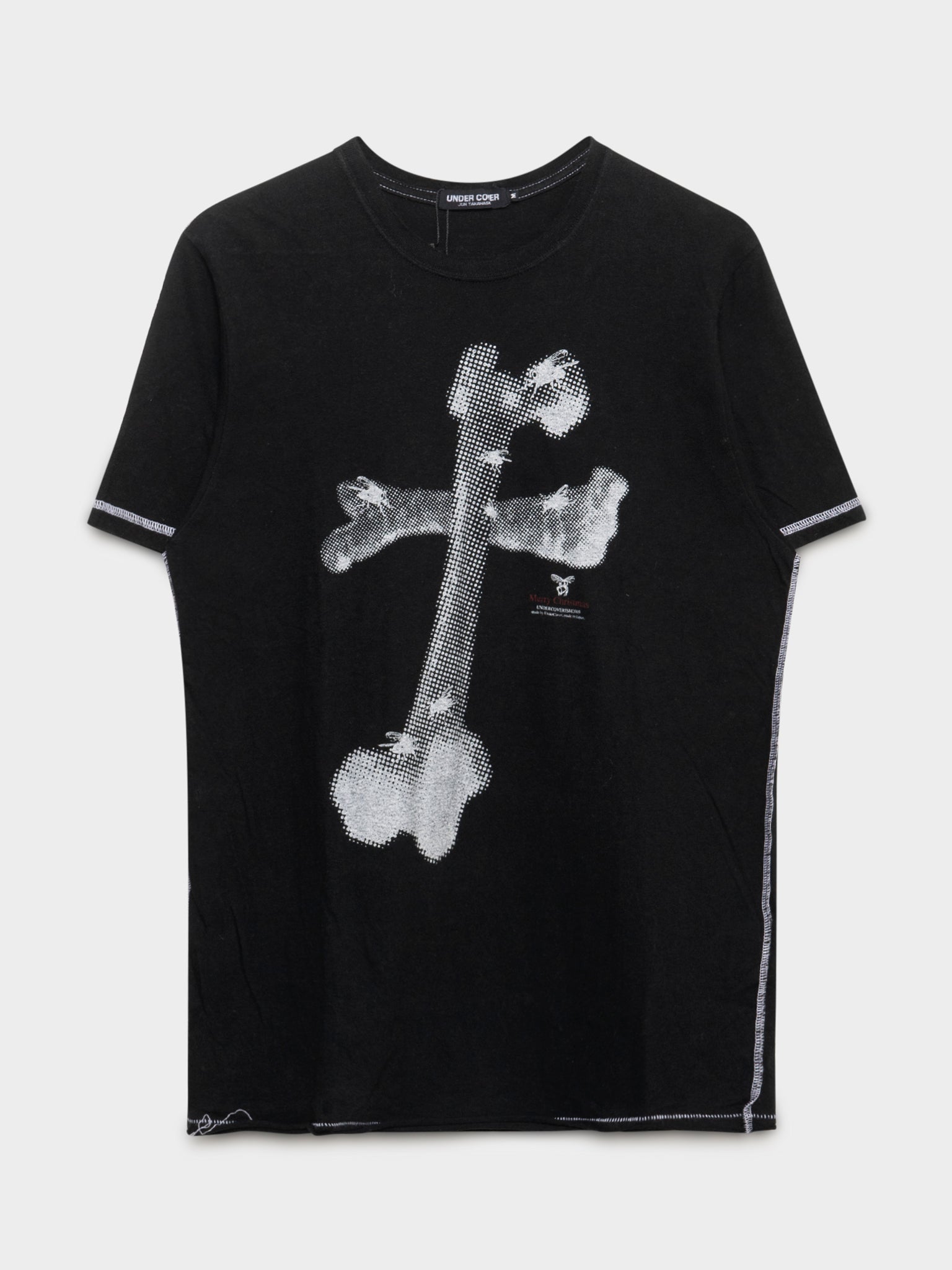 A black tee from Undercover's SS03 collection that features two large bones making a cross on the front