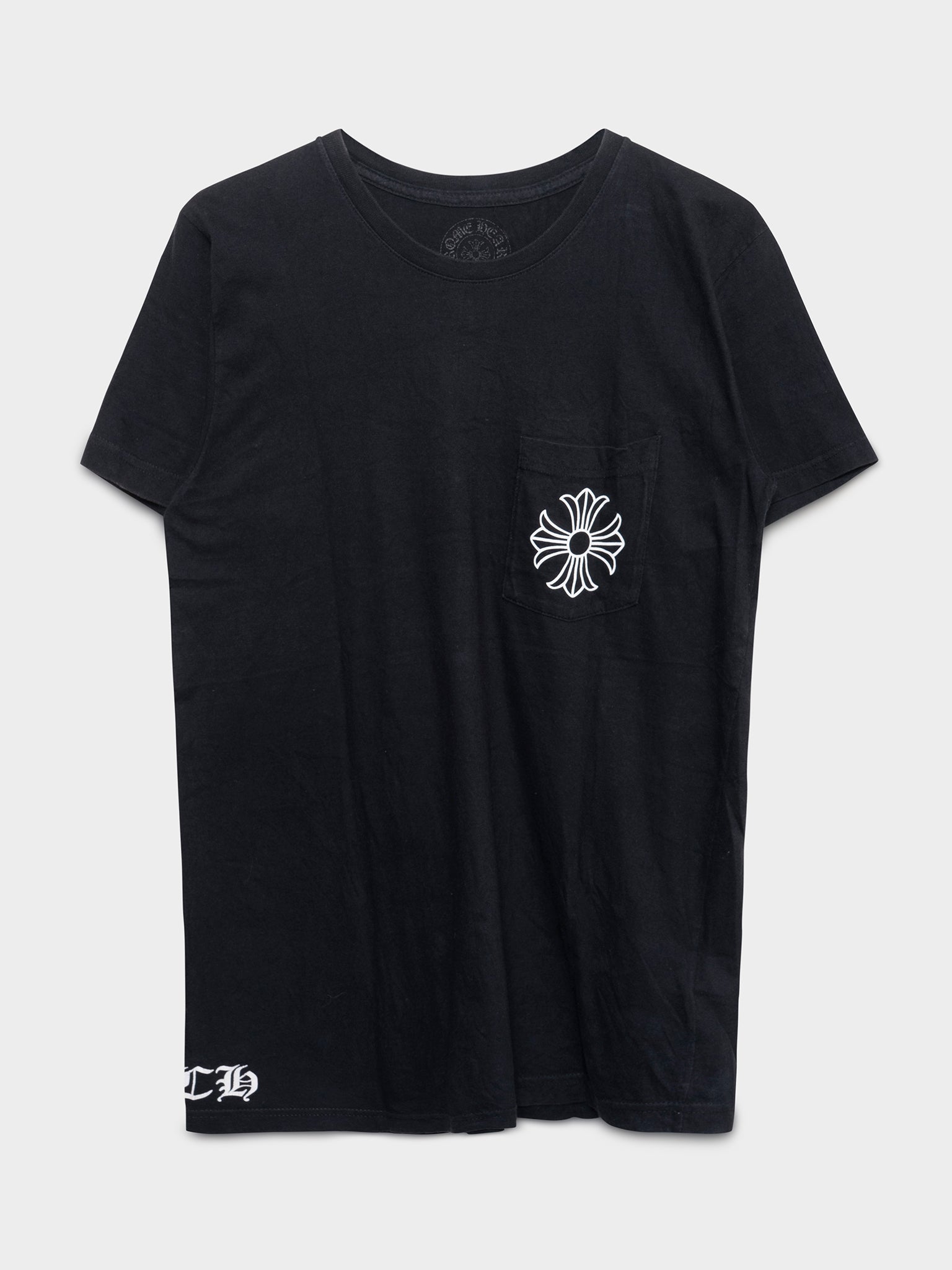 A black Chrome Hearts tee with large plus logo surrounded by all of its babies