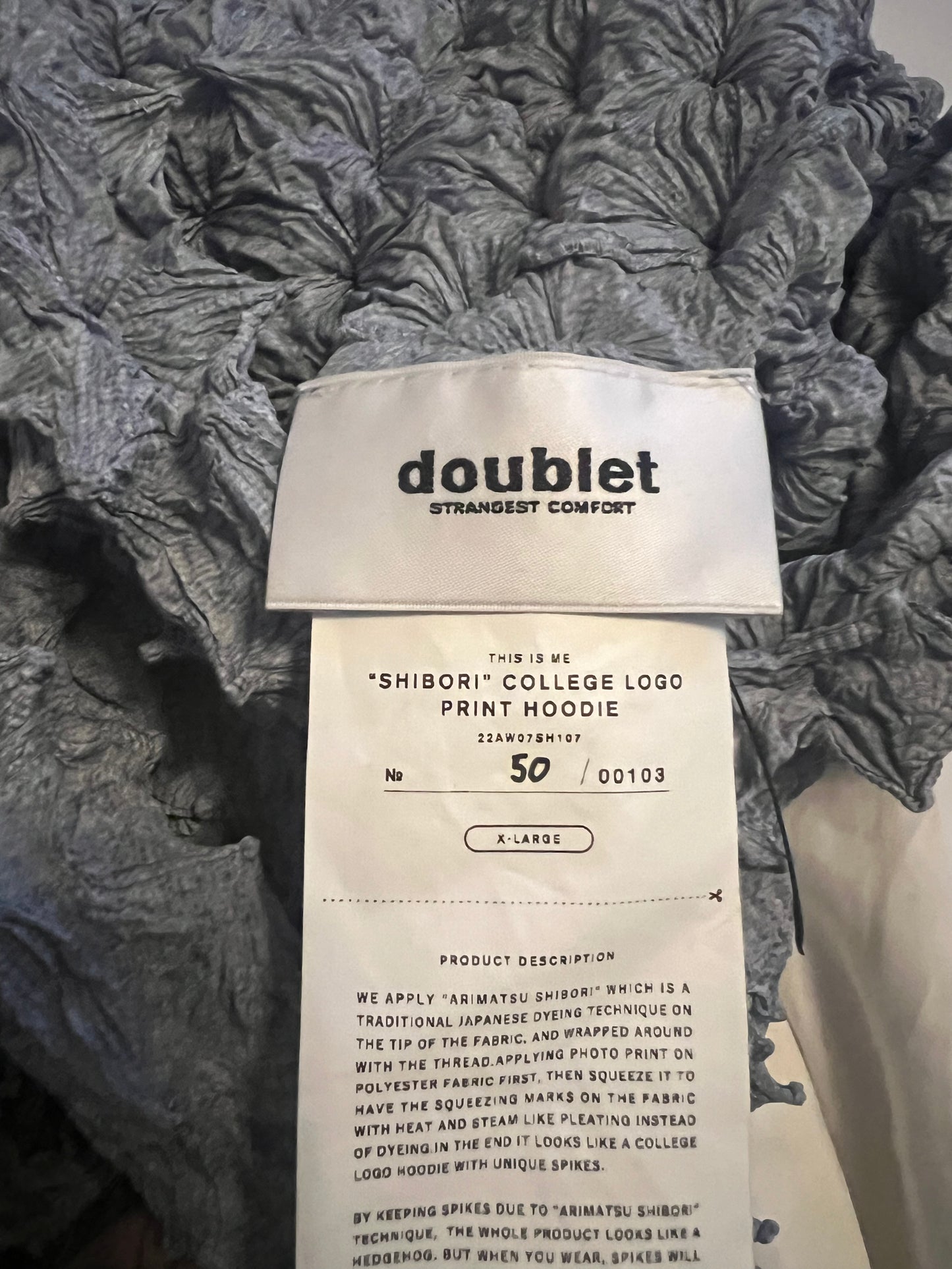 "WE APPLY "ARIMATSU SHIBORI" WHICH IS A TRADITIONAL JAPANESE DYEING TECHNIQUE ON THE TIP OF THE FABRIC. AND WRAPPED AROUND WITH THE THREAD. APPLYING PHOTO PRINT ON POLYESTER FABRIC FIRST, THEN SQUEEZE IT TO HAVE THE SQUEEZING MARKS ON THE FABRIC WITH HEAT AND STEAM LIKE PLEATINO INSTEAO OF DYEING IN THE END IT LOOKS LIKE A COLLEGE LOGO MOODIE WITH UNIQUE SPIKES.
