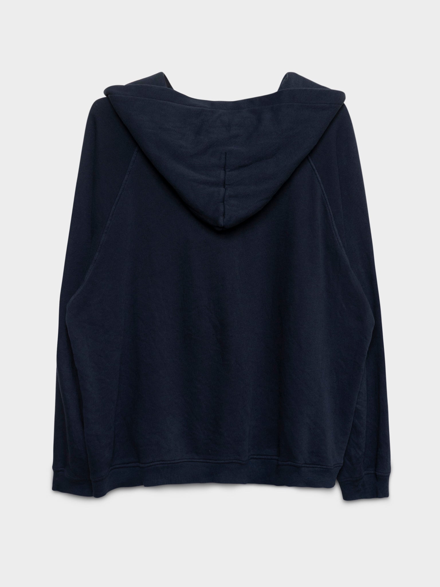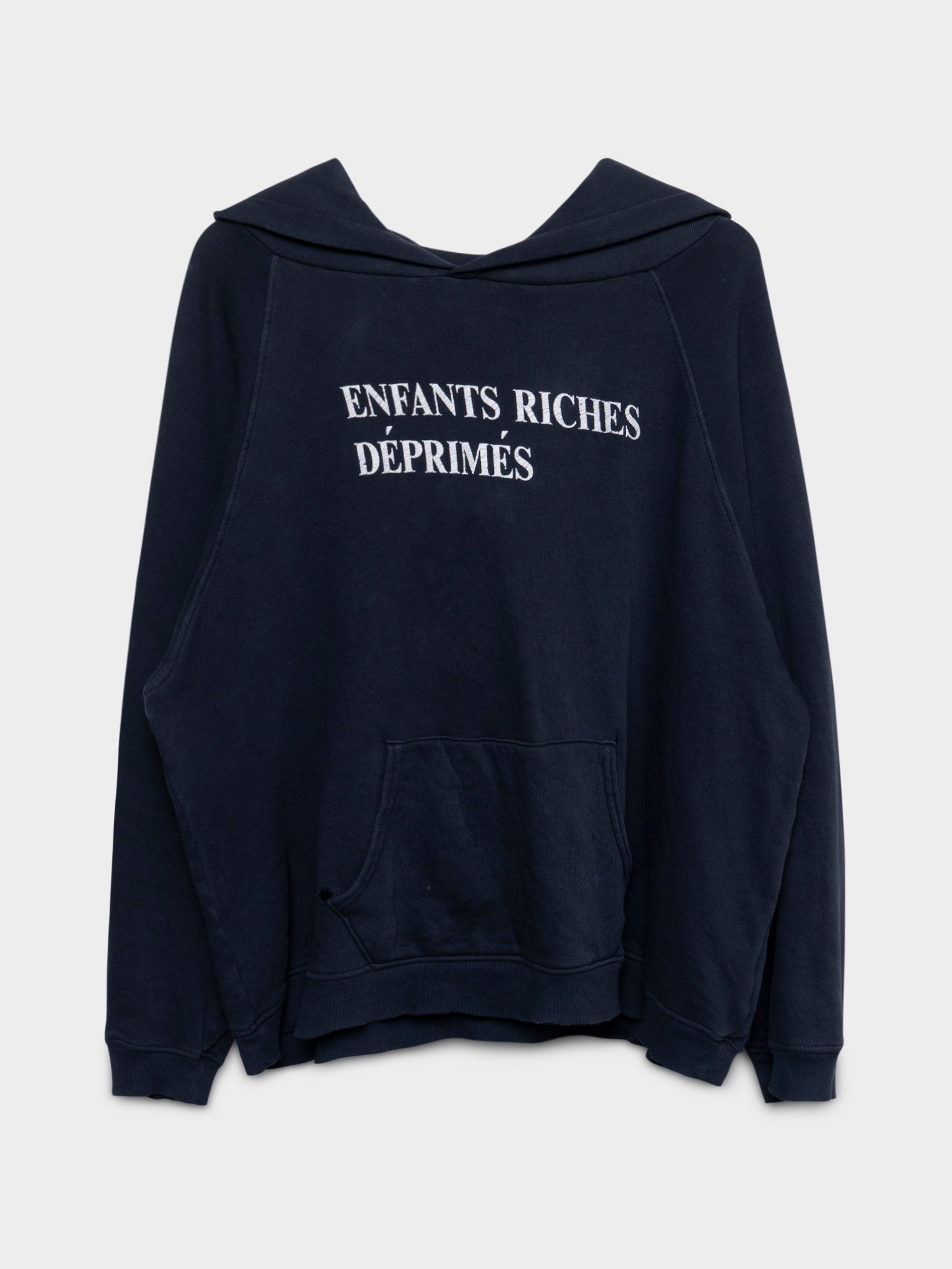 A boxy cropped deep navy hoodie from Enfants Riches Deprimes with the logo across the chest
