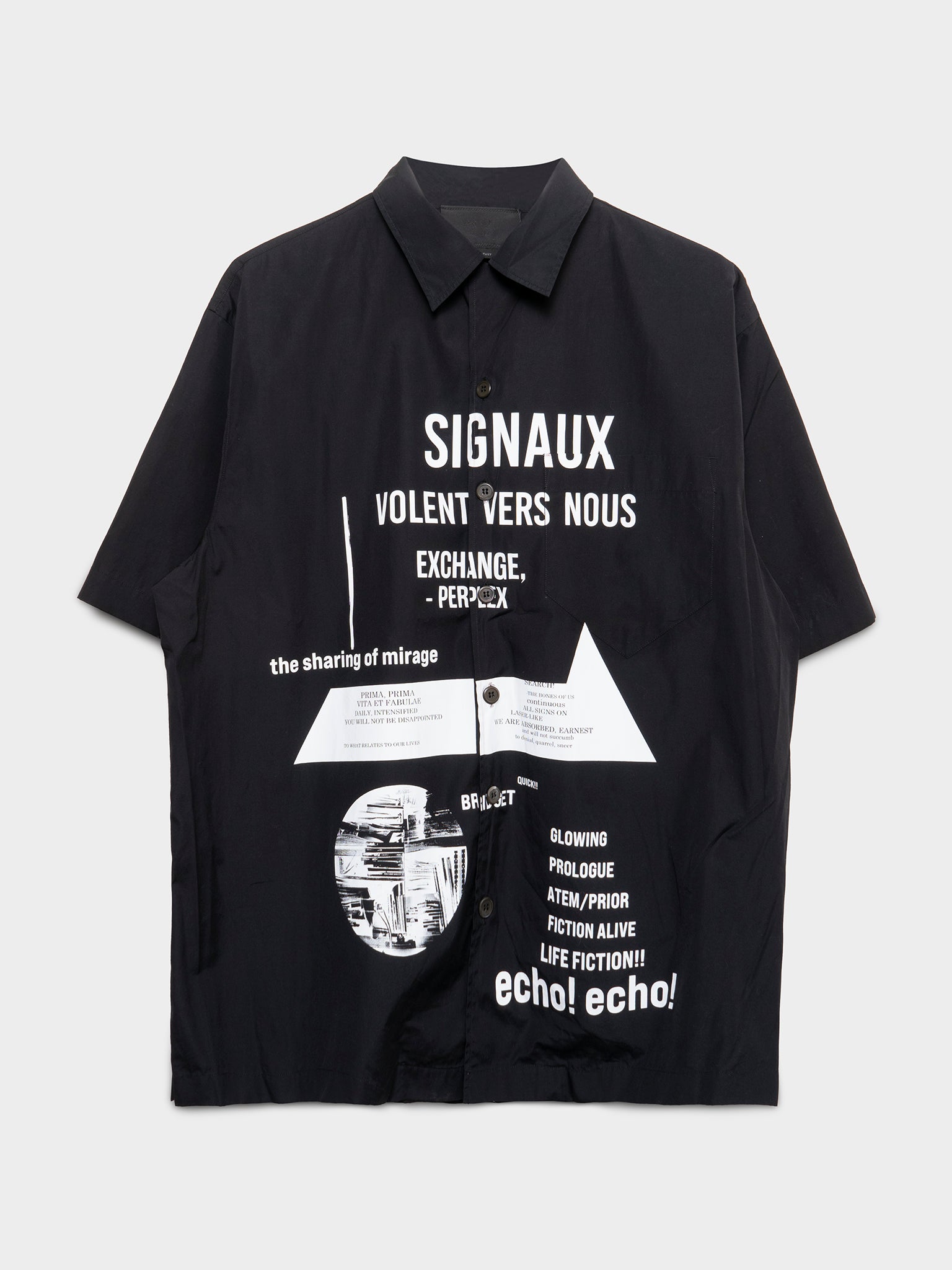 An oversized black Prada camp collar shirt with 'Signaux' graphics on the front from Raf's first collection at Prada.