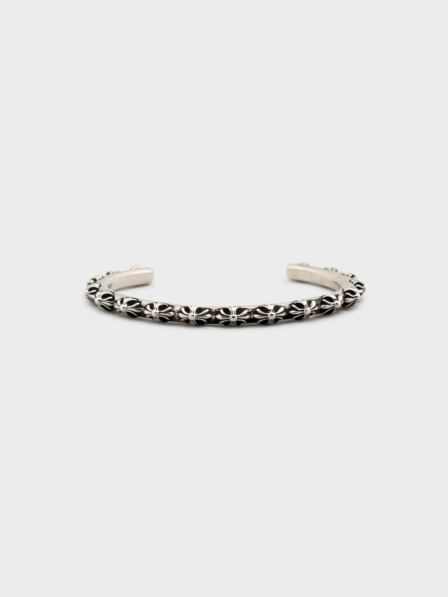 The Cross Bangle, a staple design from Chrome Hearts. With the opened end of the cuff, this bracelet can be sized to fit anybody.