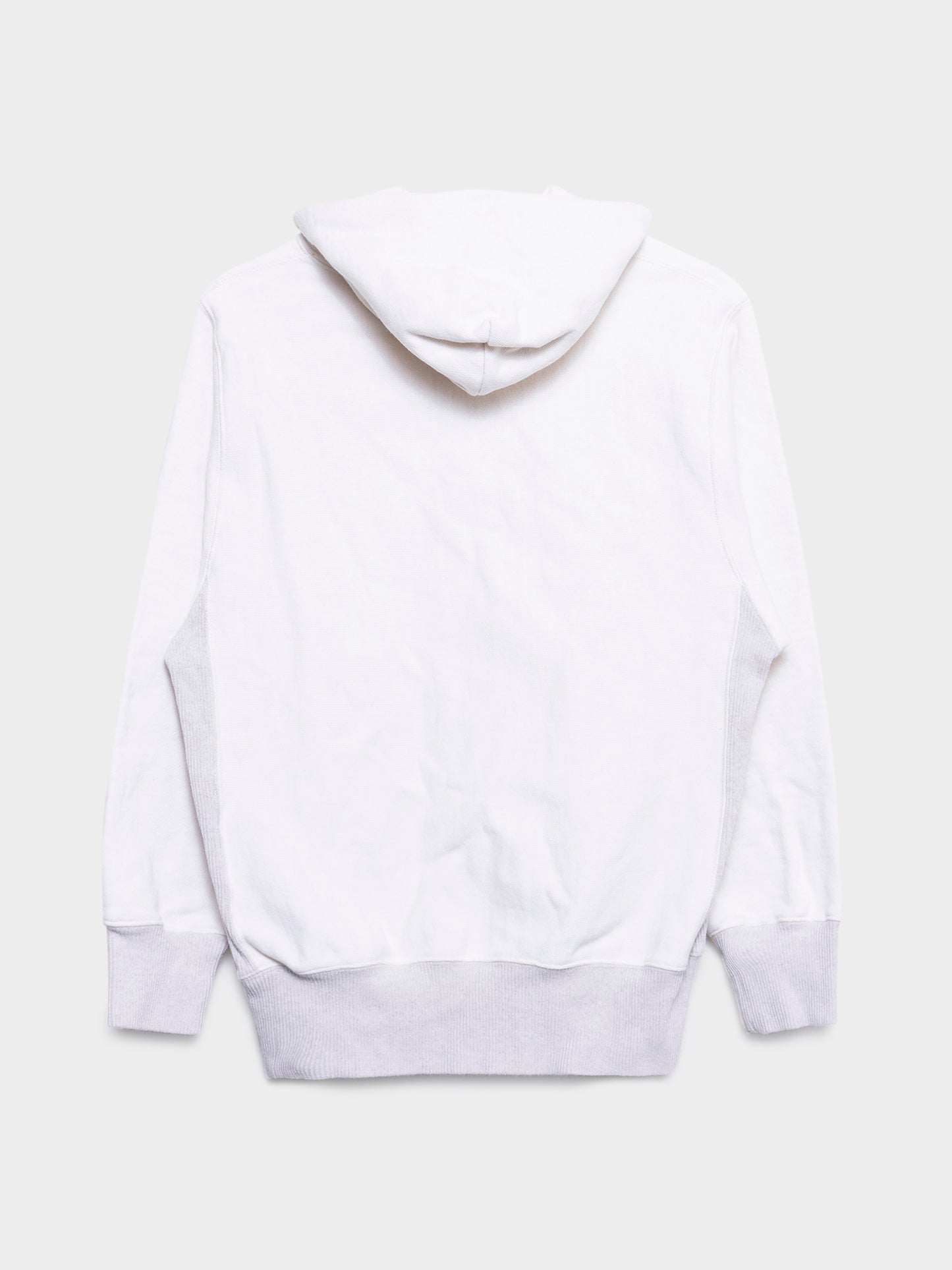 A two-toned Kapital hoodie with grey ribbing and a large bright yellow smiley face on the center that transfers to the drawstrings