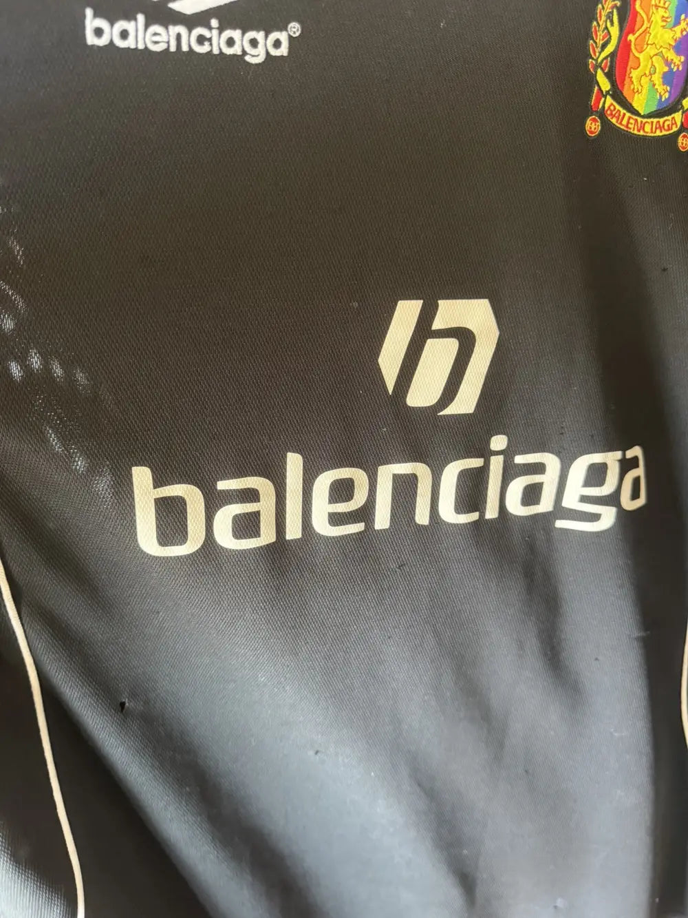 A classic soccer kit reimagined by Balenciaga with their crest and brand name across the front.