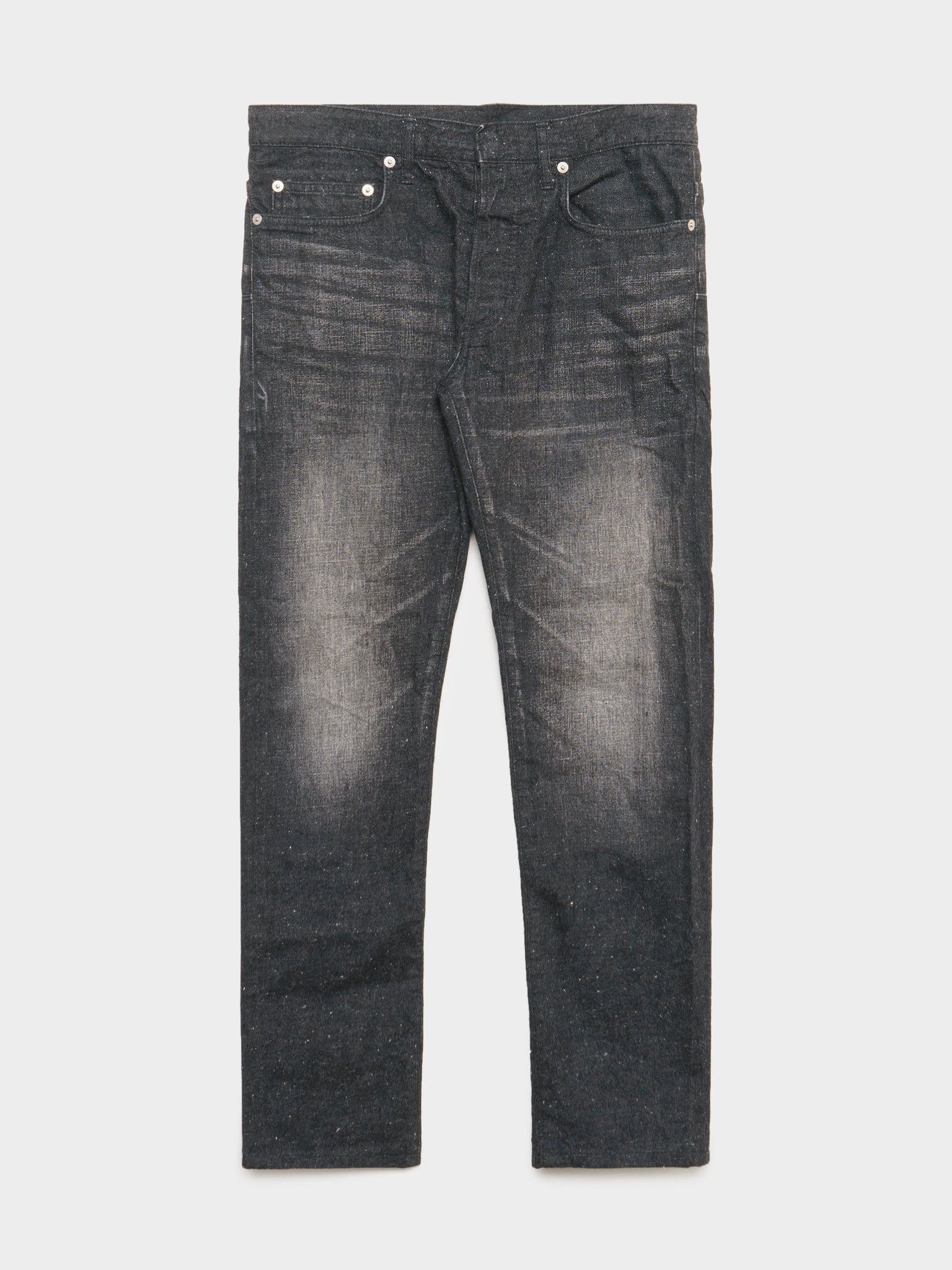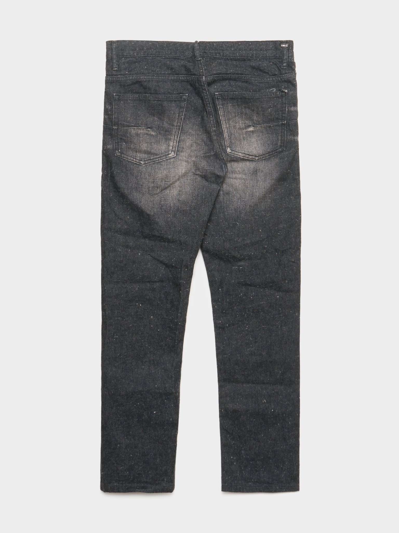 A pair of grey Dior jeans that have white specks in the fabric weave.