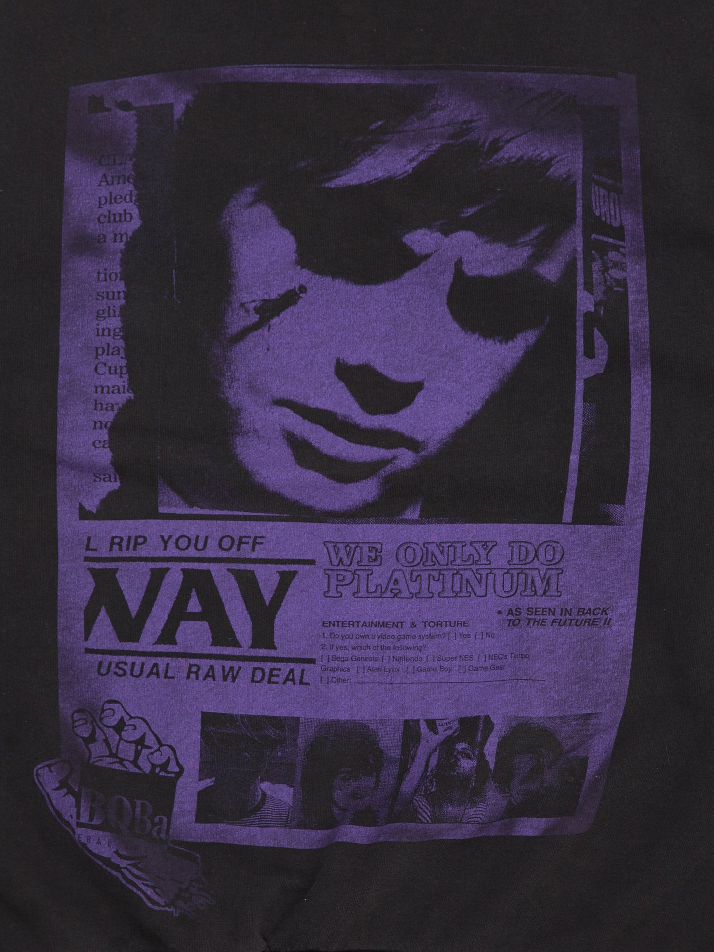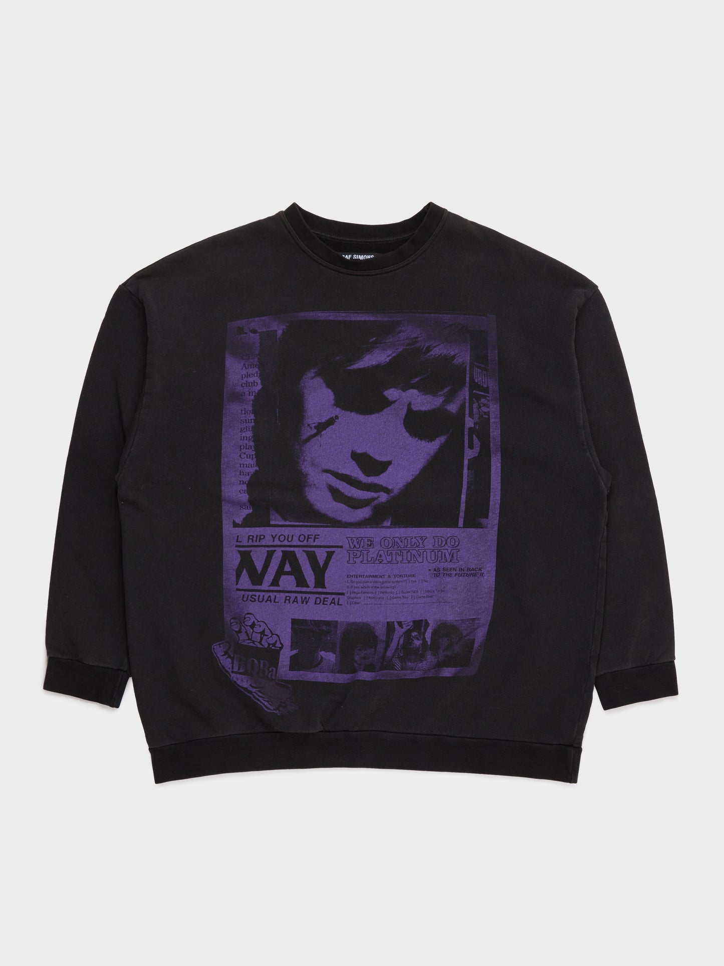 This archival crewneck features a Richie Manic newspaper print graphic on the front in a deep purple font.