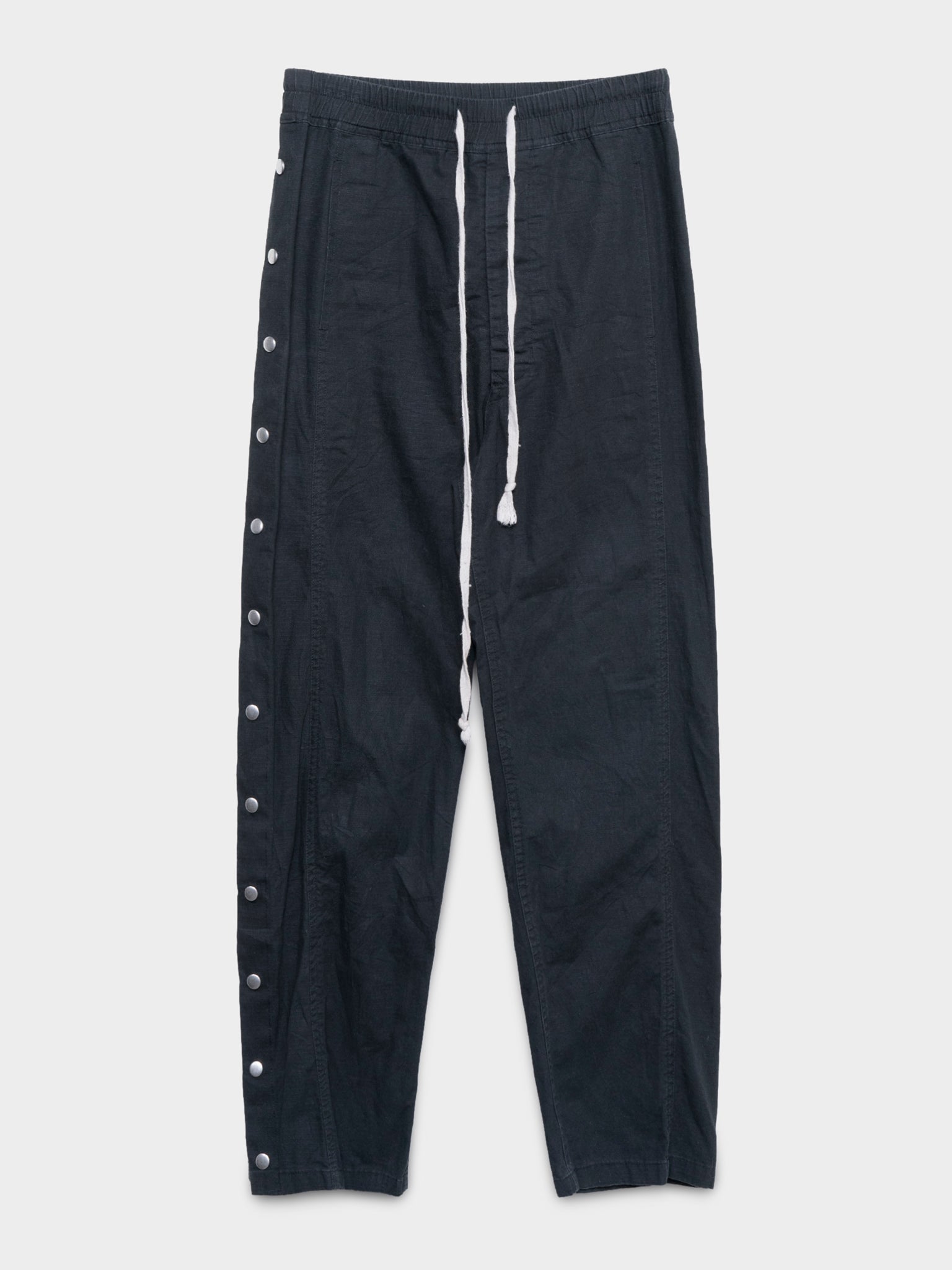 A pair of black Rick Owens easy pusher joggers with the snaps running down the sides from his SS19 collection 'Babel'
