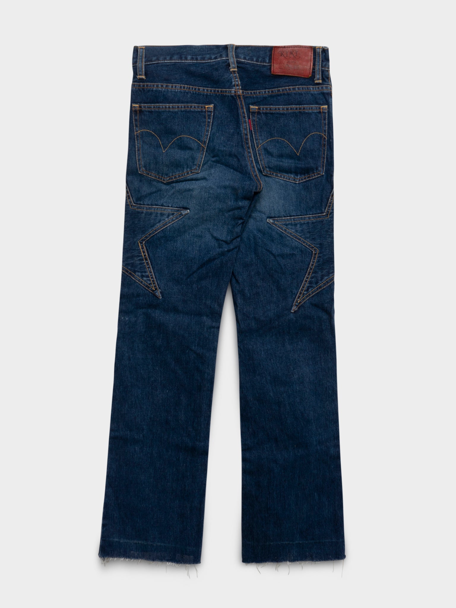 A pair of light wash Hysteric Glamour jeans with embroidered stars on the sides and slight flare at the hem