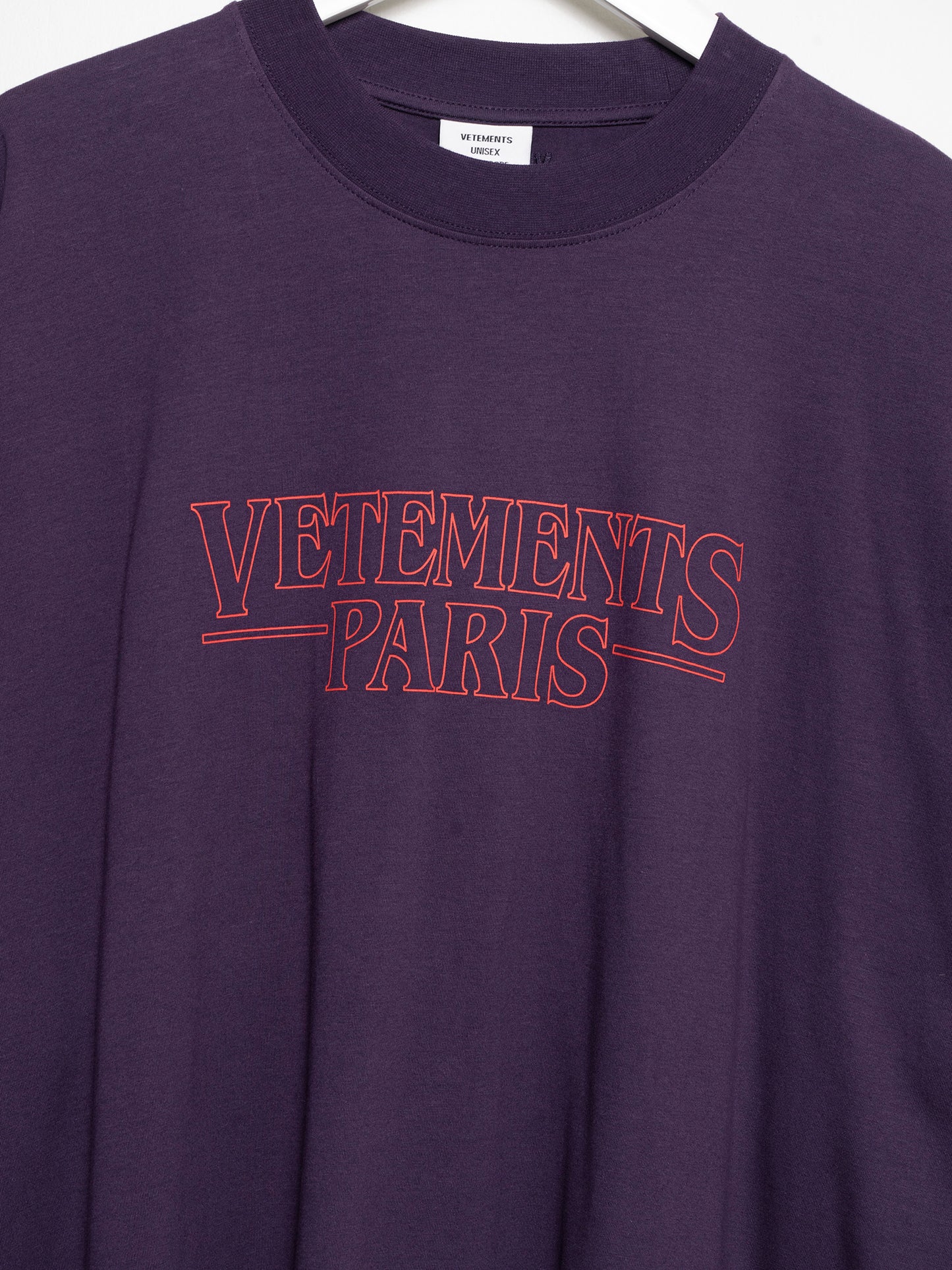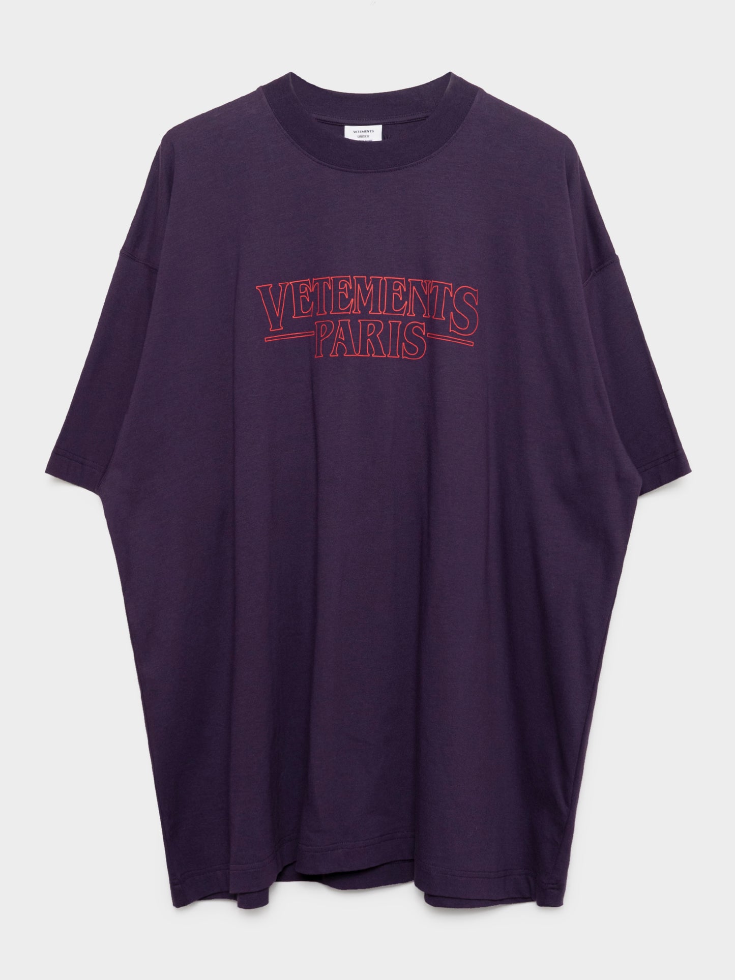 A deep purple Vetements t-shirt with their logo in the same font as Stranger Things, part of Demna's bootleg series