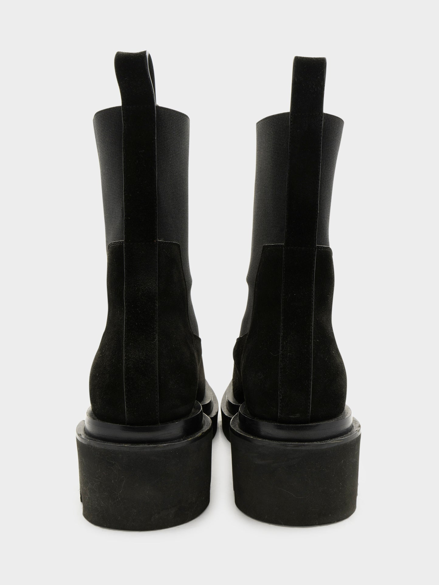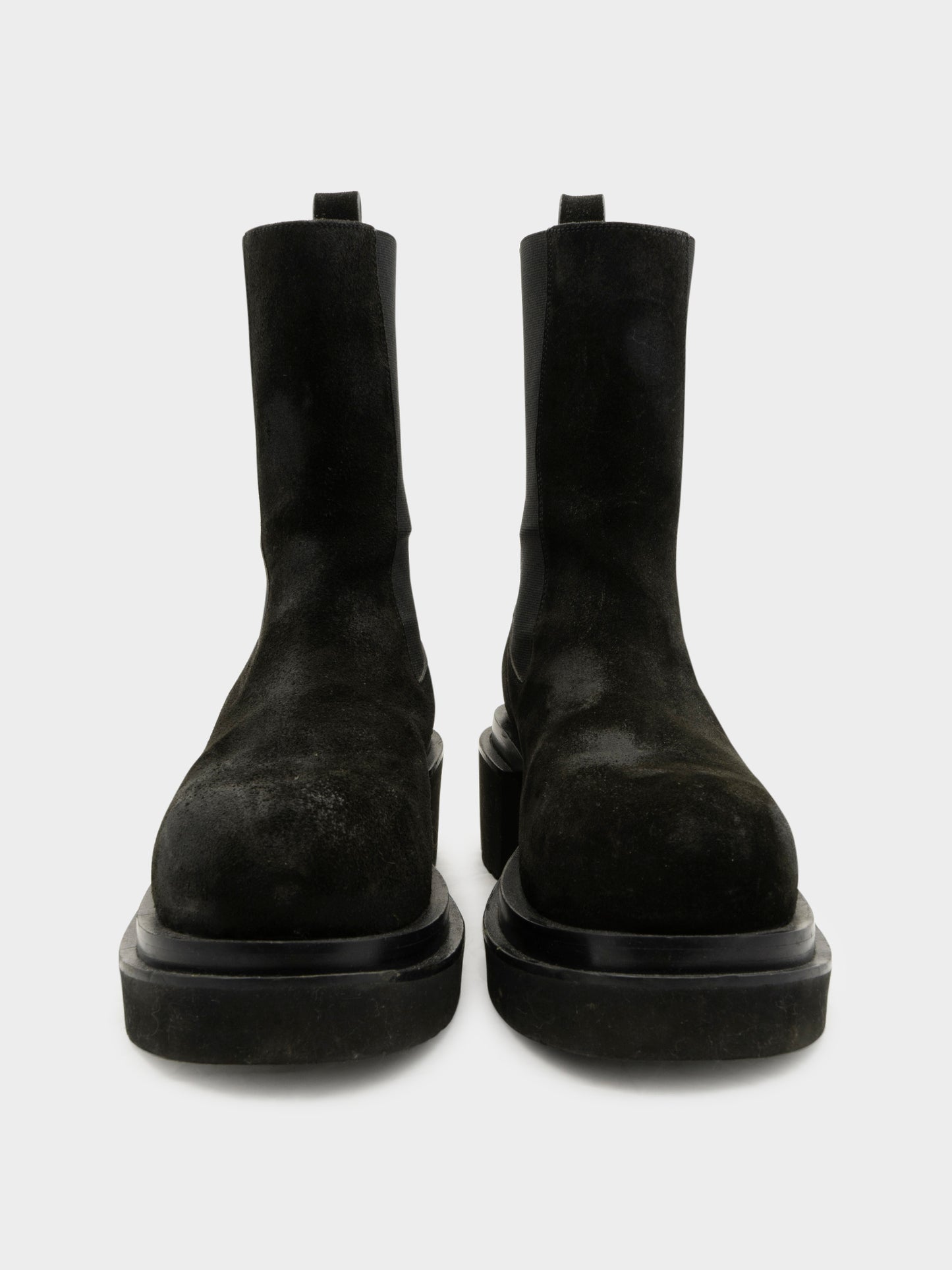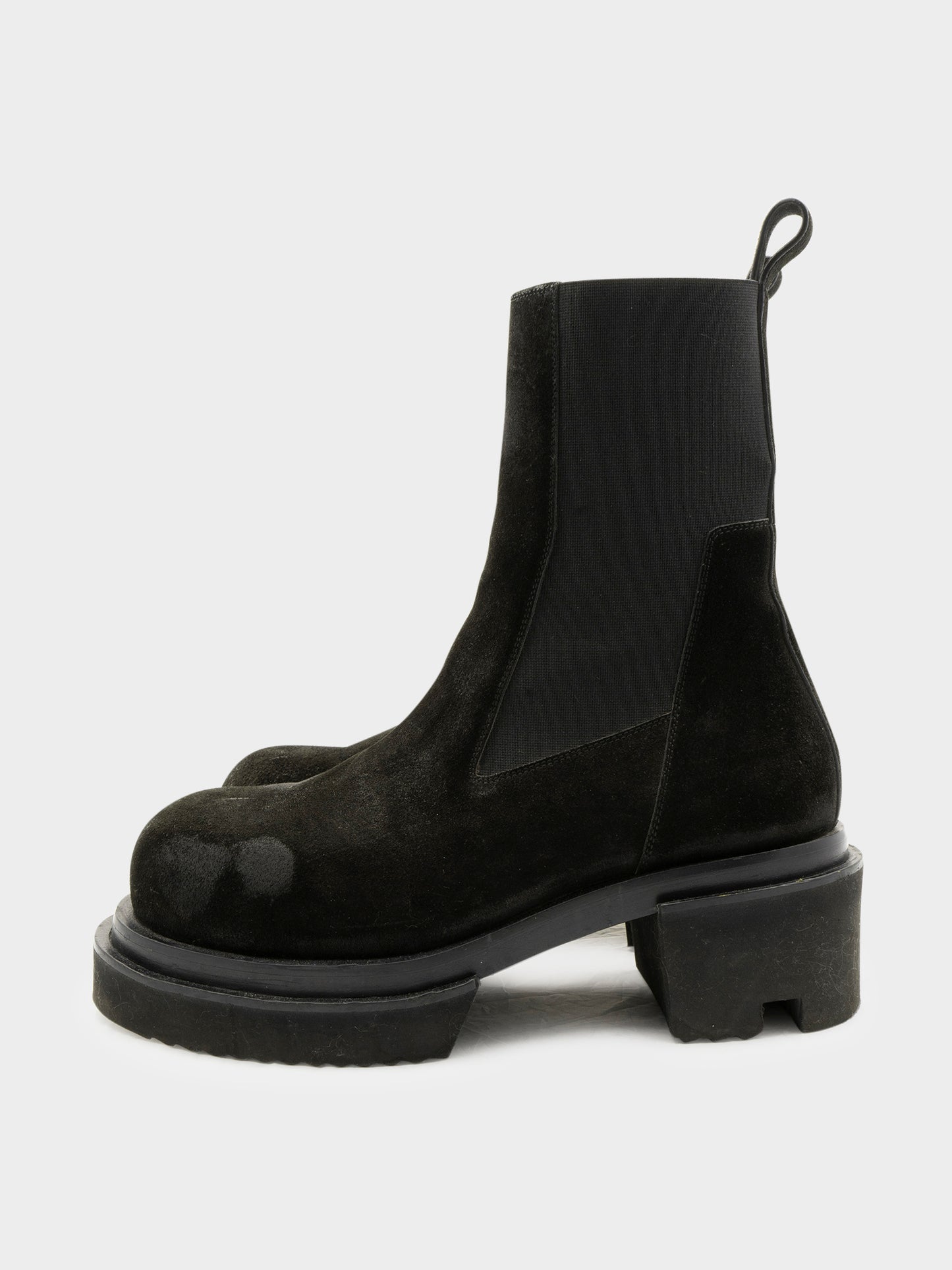 A pair of Rick Owens Beatle Boots crafted out of a buttery smooth sueded with their chunky split sole