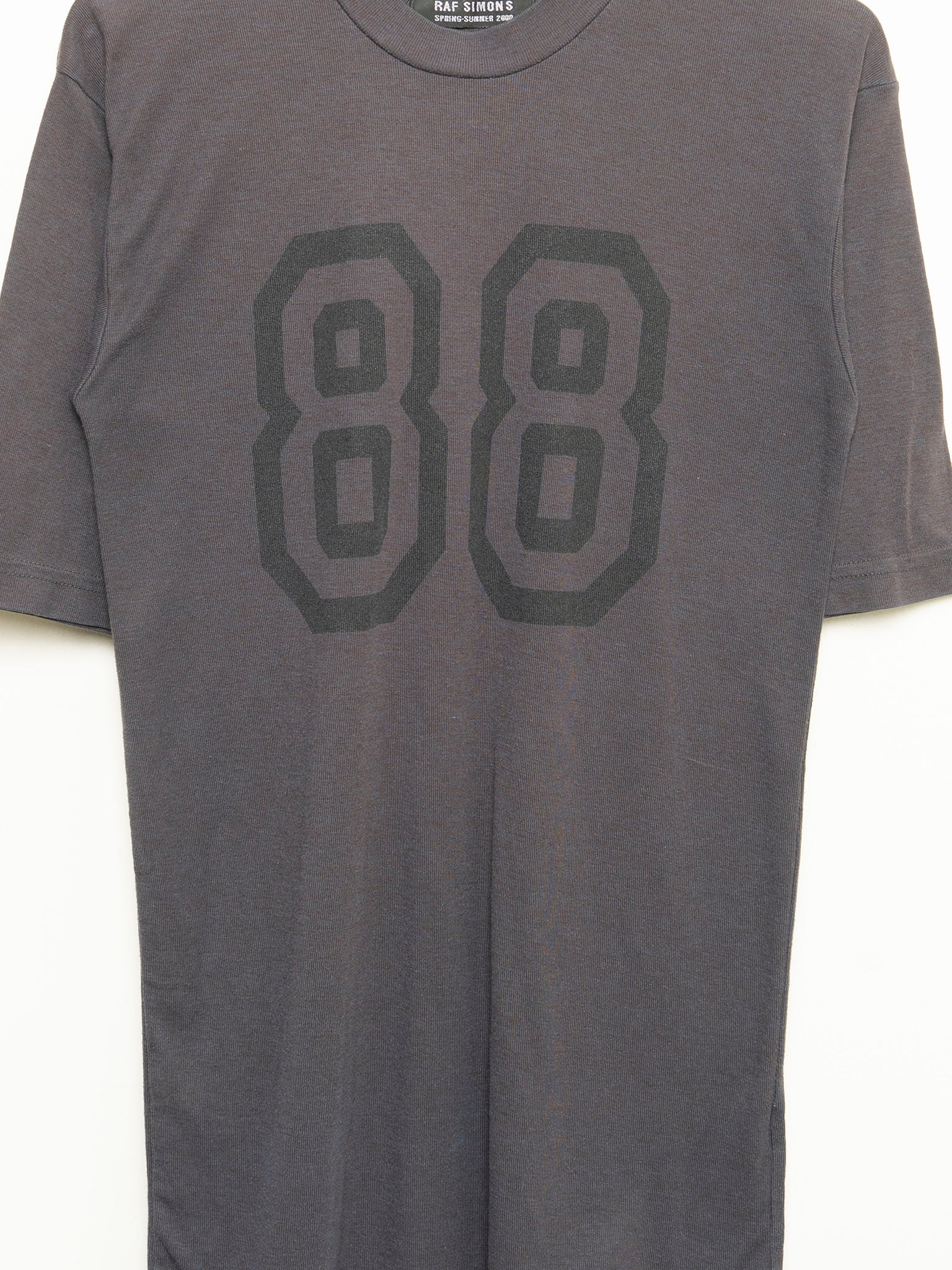 From Raf Simons's SS00 collection 'Summa Cum Laude' comes this grey/purple tee that resembles a vintage sports jersey.